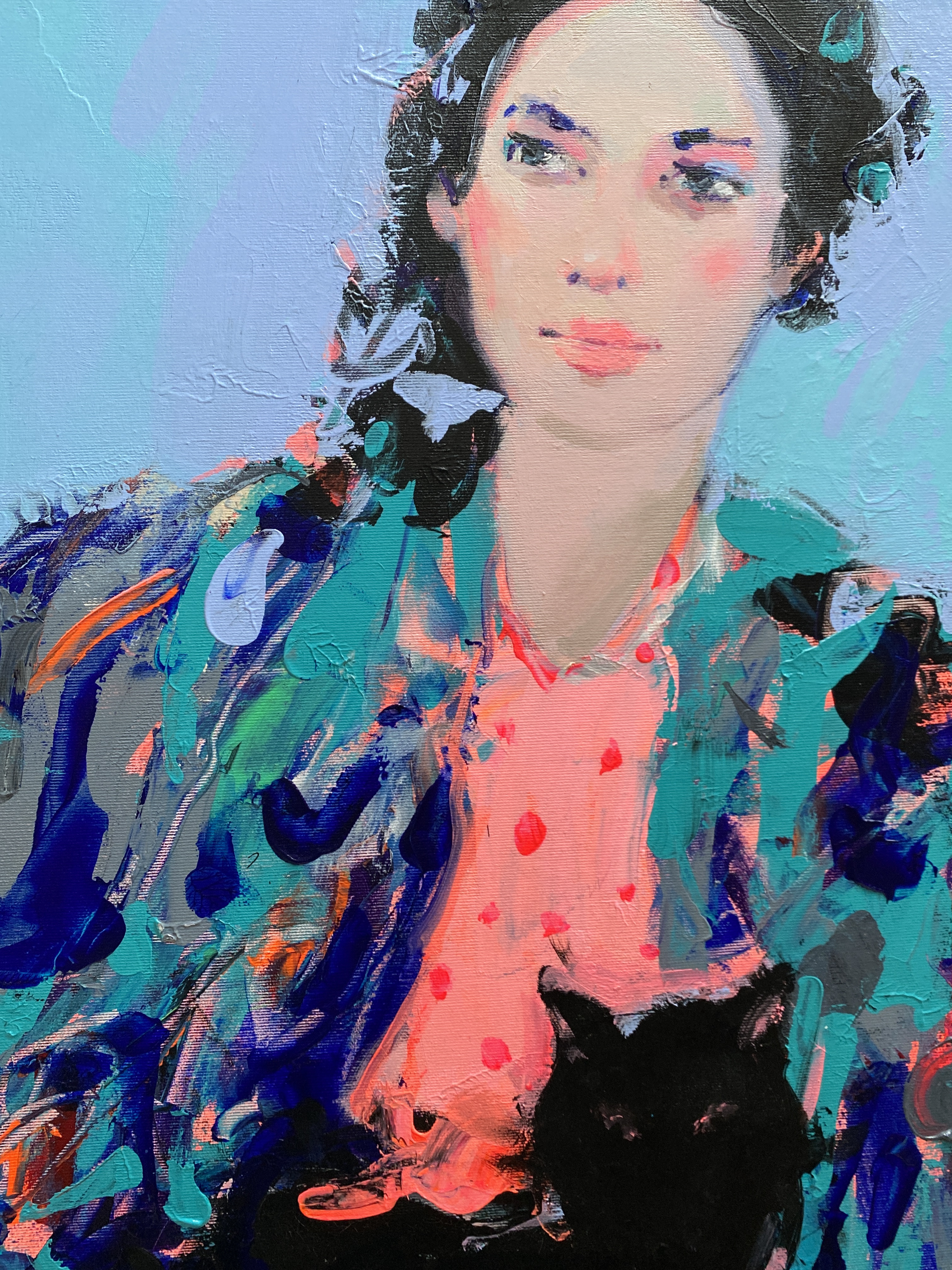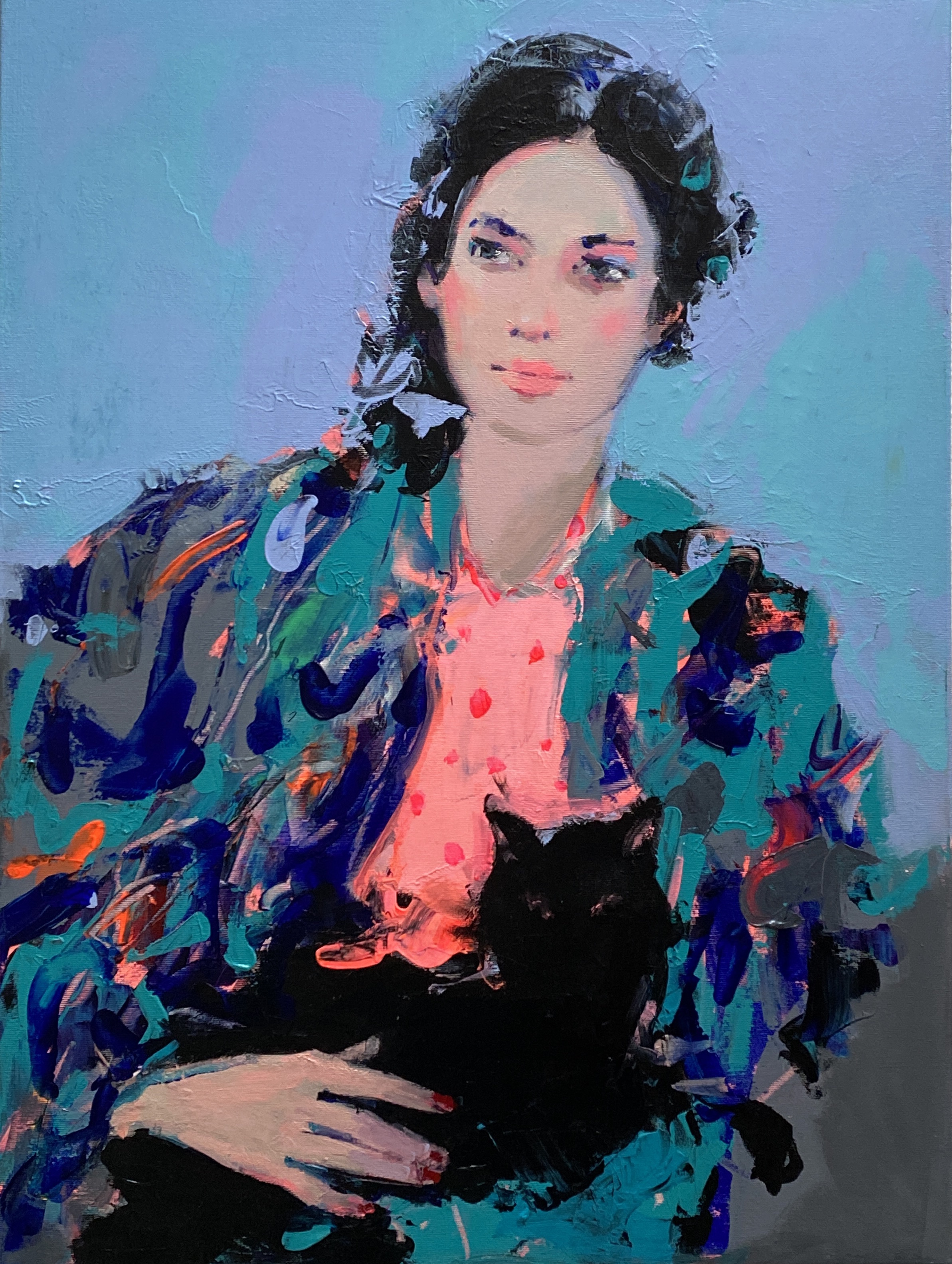 Cool blues and turquoises define the atmosphere, while warm pinks and skin tones create a sense of intimacy. The black cat acts as a calm, grounding element, reinforcing the quiet presence of the moment. Closeness, protection, and stillness are not explicitly depicted, but rather conveyed through posture, color harmony, and rhythm.