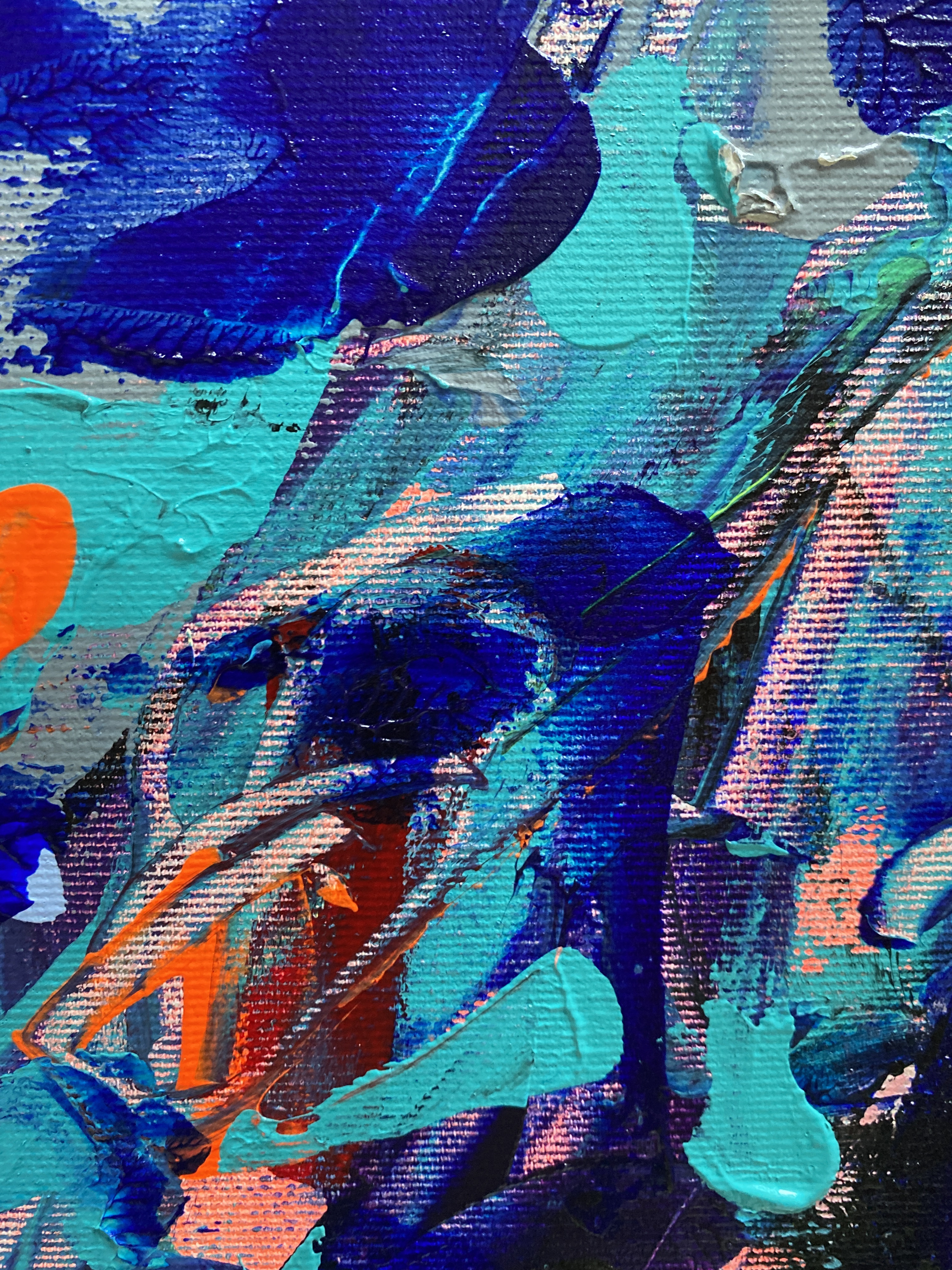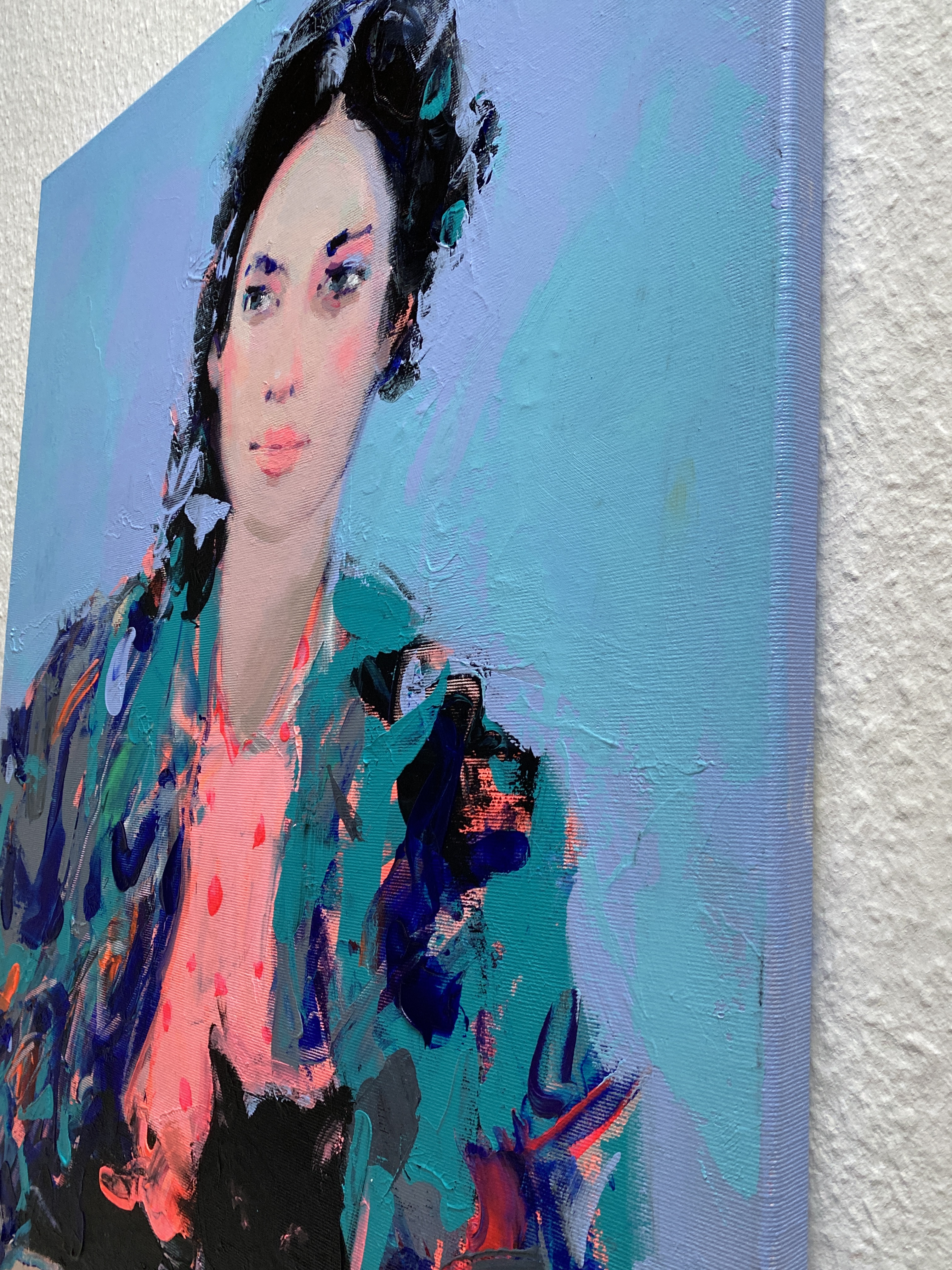 This painting symbolizes the balance between stillness and movement. The figure remains motionless, while the open, visible brushstrokes and the multi-layered color fields are in motion.