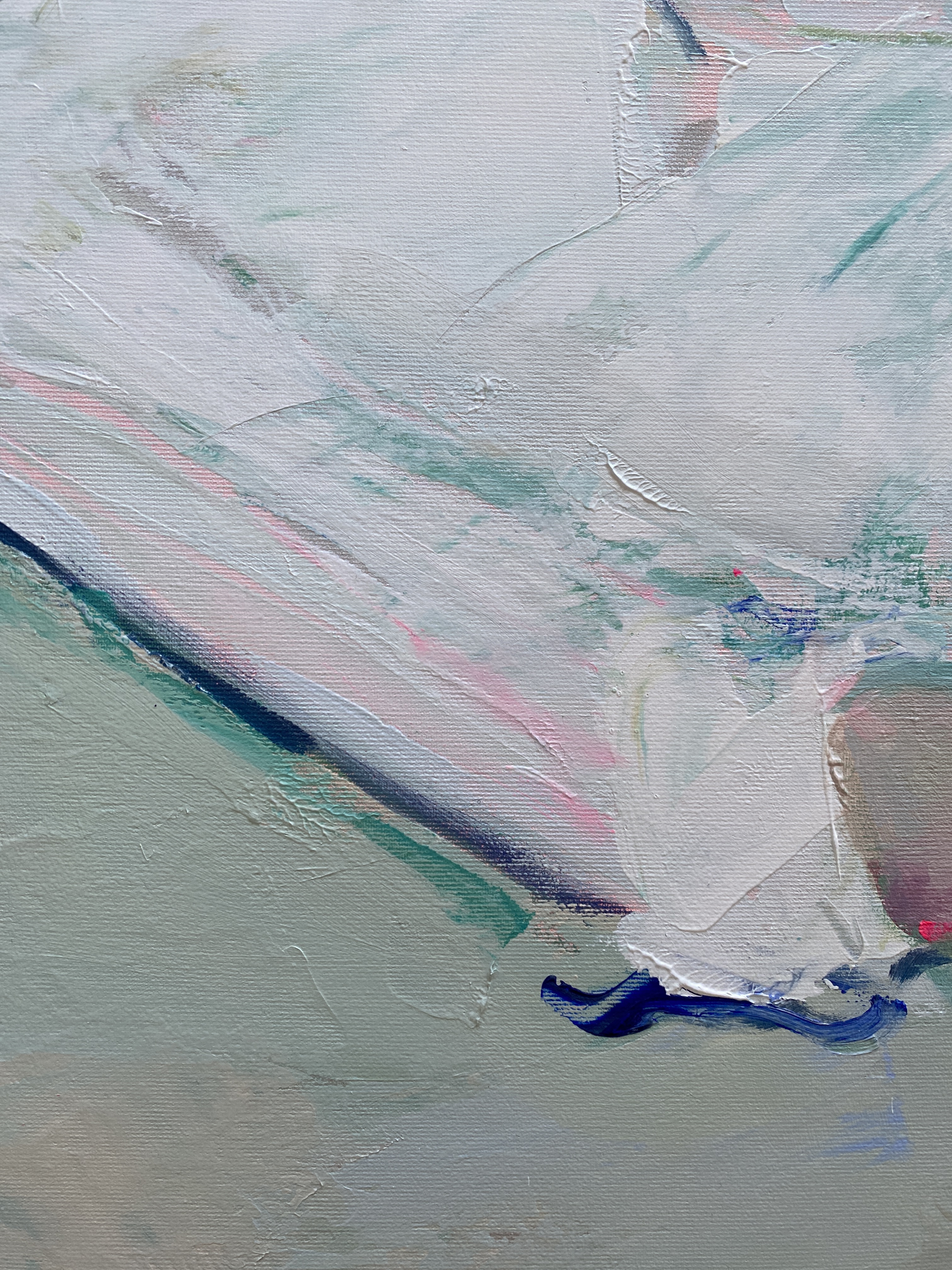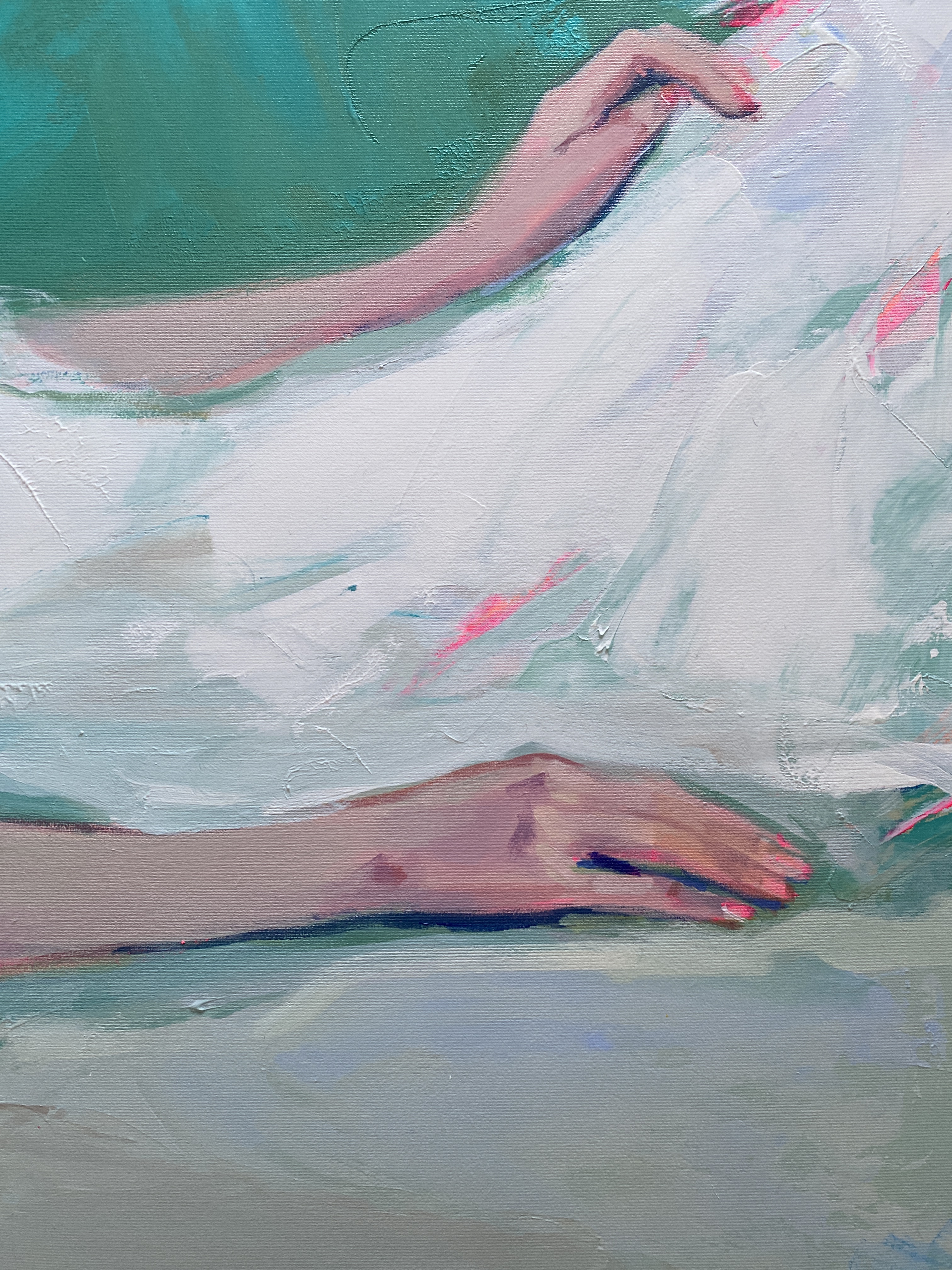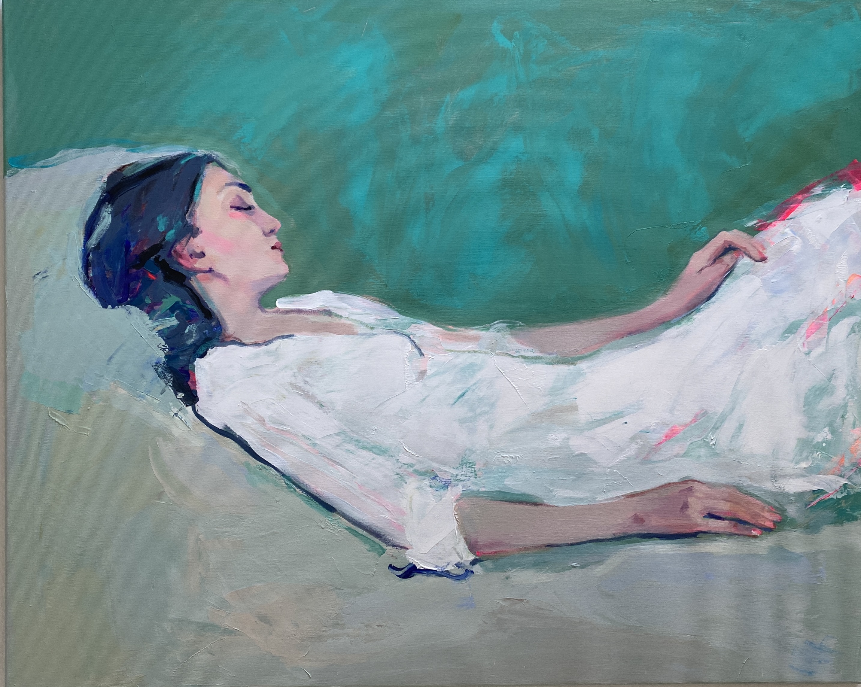 This painting symbolizes the balance between stillness and movement. The figure remains motionless, sleeping, calm while the open, visible brushstrokes and the multi-layered color fields are in motion.
