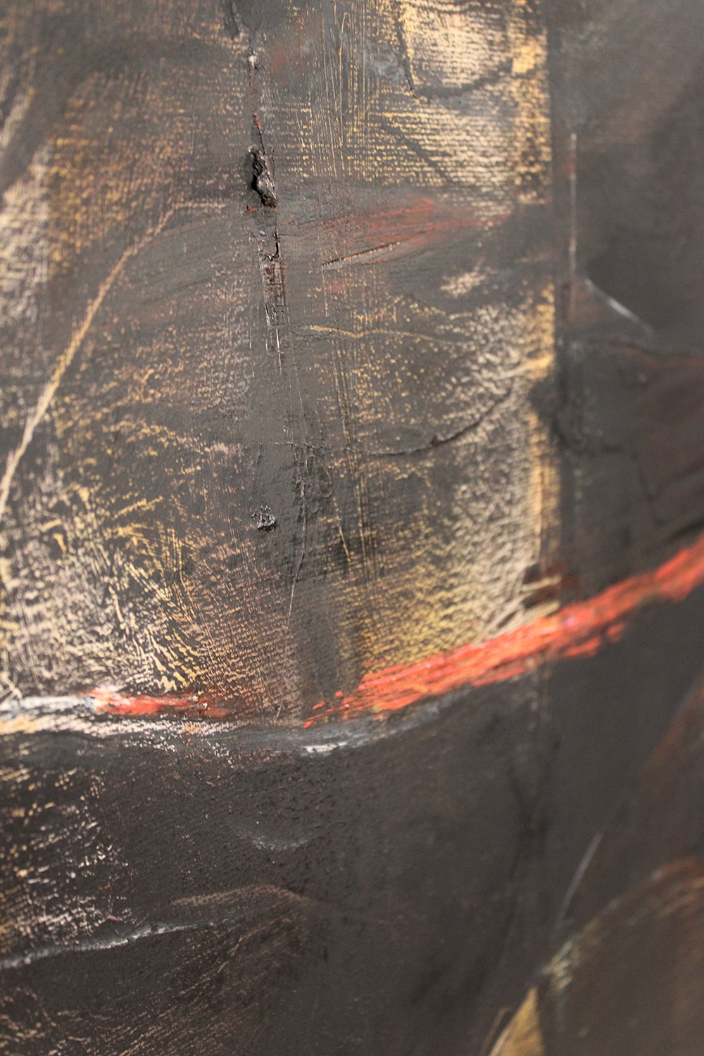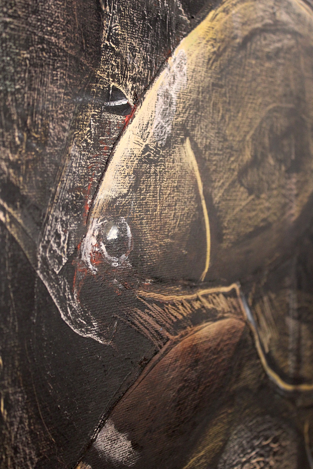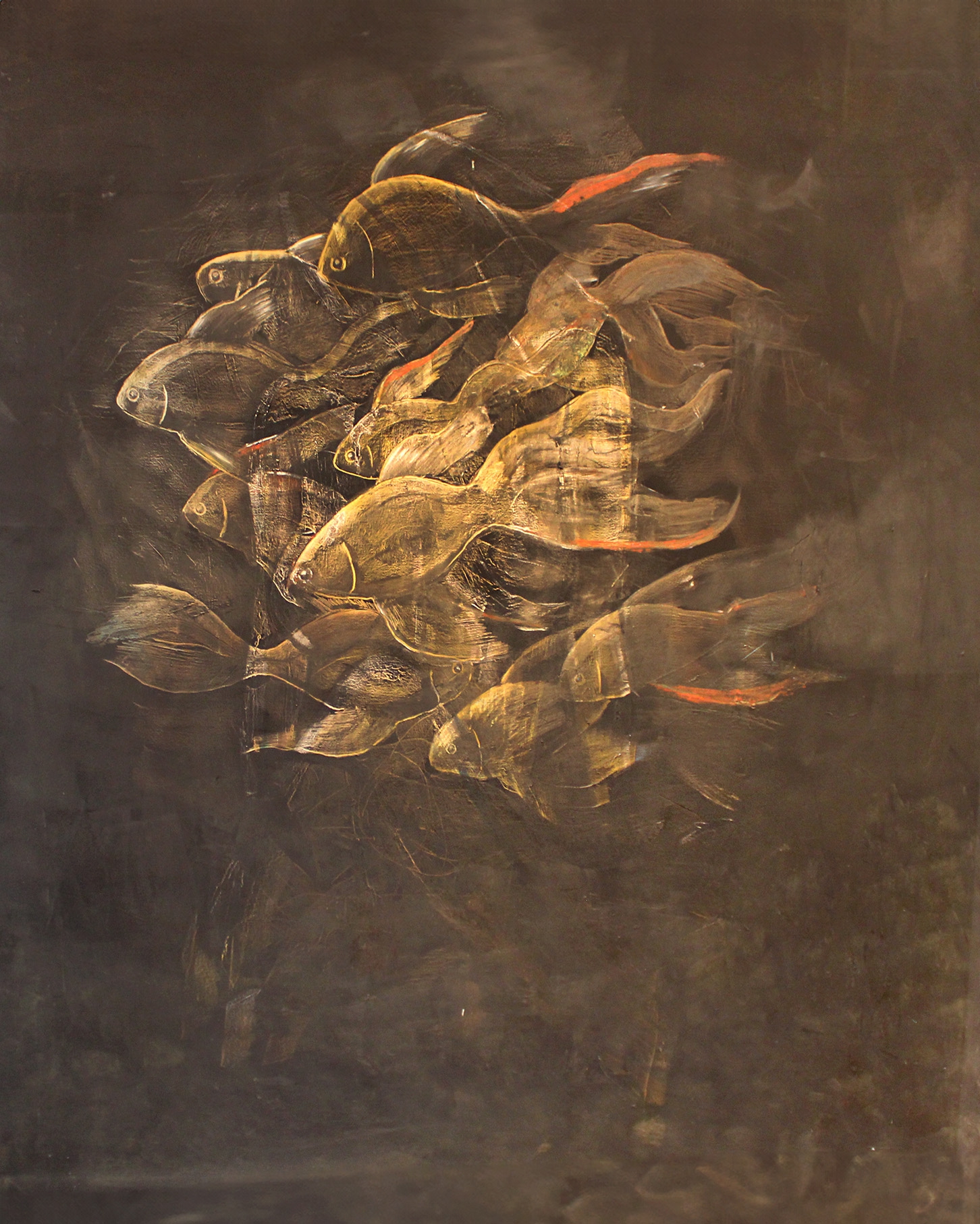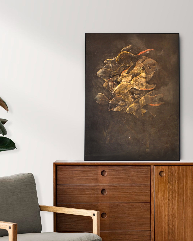 A swarm of goldfish drifts across a deep brown background, their delicate forms painted in soft, translucent layers of oil on canvas. The subtle brushwork gives the fish an almost weightless presence, as if they are floating through water and light. The composition captures quiet movement and harmony, blending contemporary aesthetics with a poetic sense of calm.