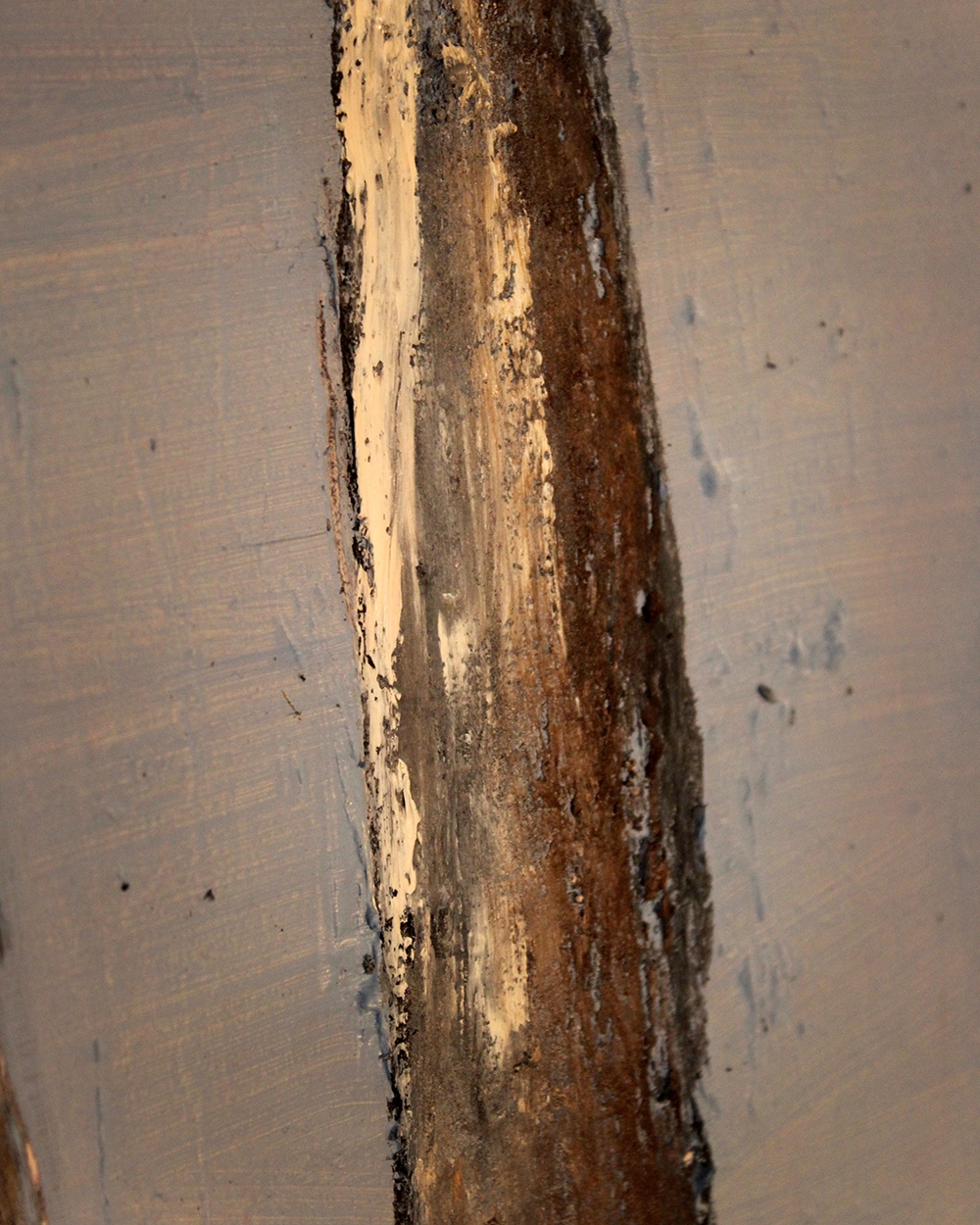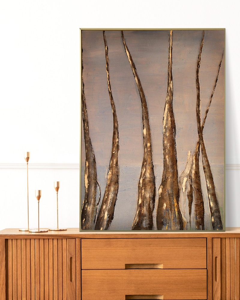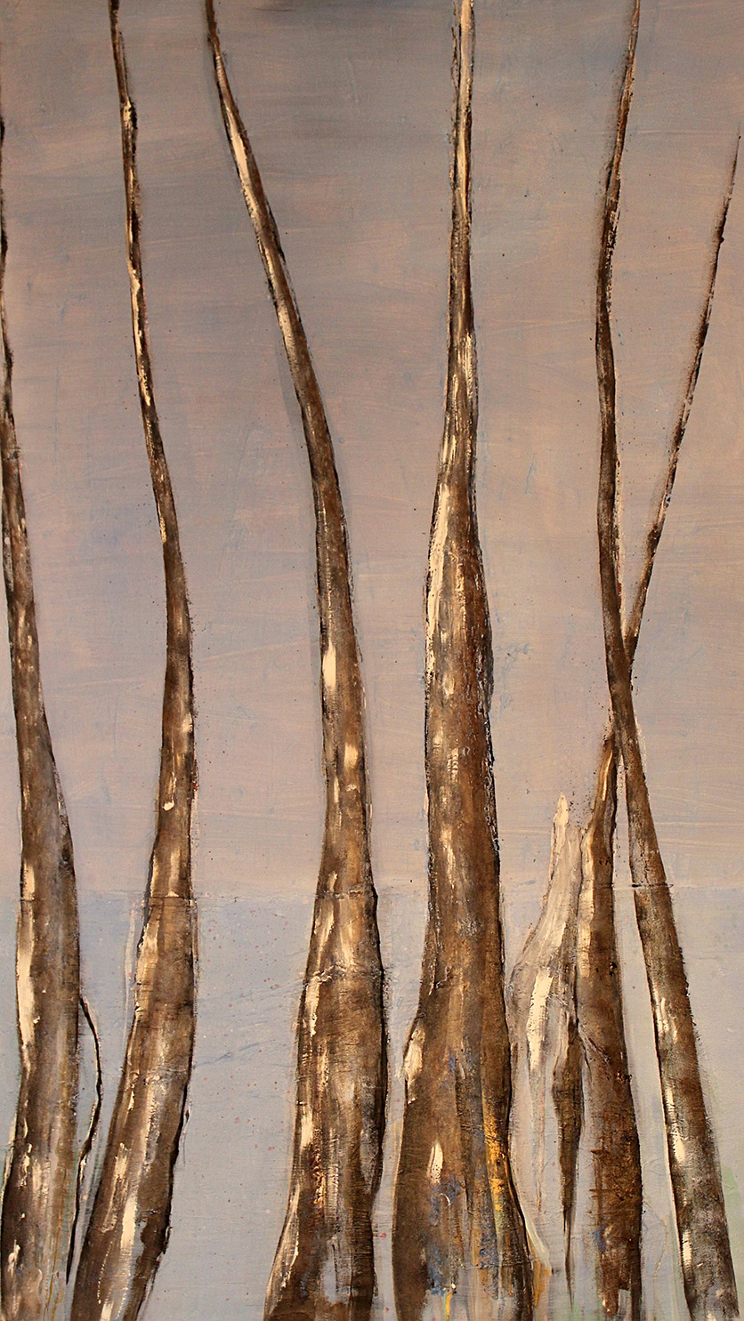This painting presents a vertical rhythm of slender tree trunks rising into a soft, muted sky. The elongated forms and textured surfaces create a quiet, contemplative atmosphere. Earthy browns contrast gently with the pale blue background, emphasizing both strength and fragility. The composition feels minimalist yet expressive, capturing the stillness and subtle movement of a forest.