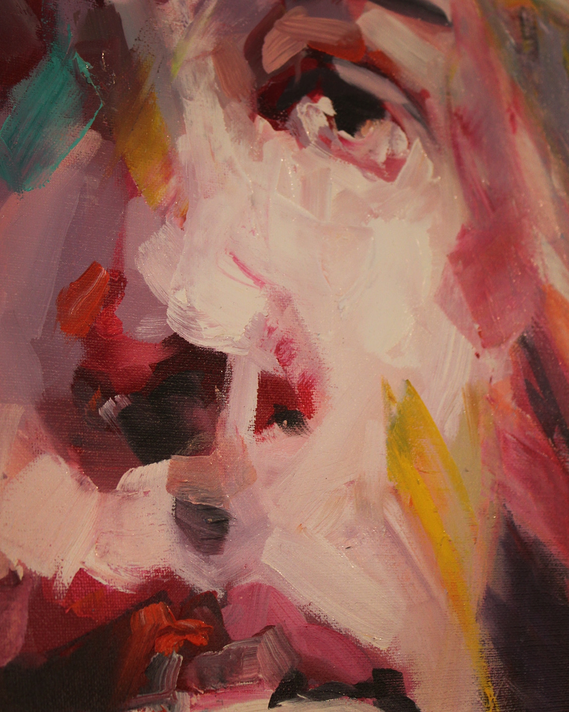 Luminous colors overlap and collide, and the portraits convey a sense of liveliness and vitality. The interplay between abstraction and figuration lends the paintings a powerful psychological presence; the subject matter appears both tangible and ephemeral.
