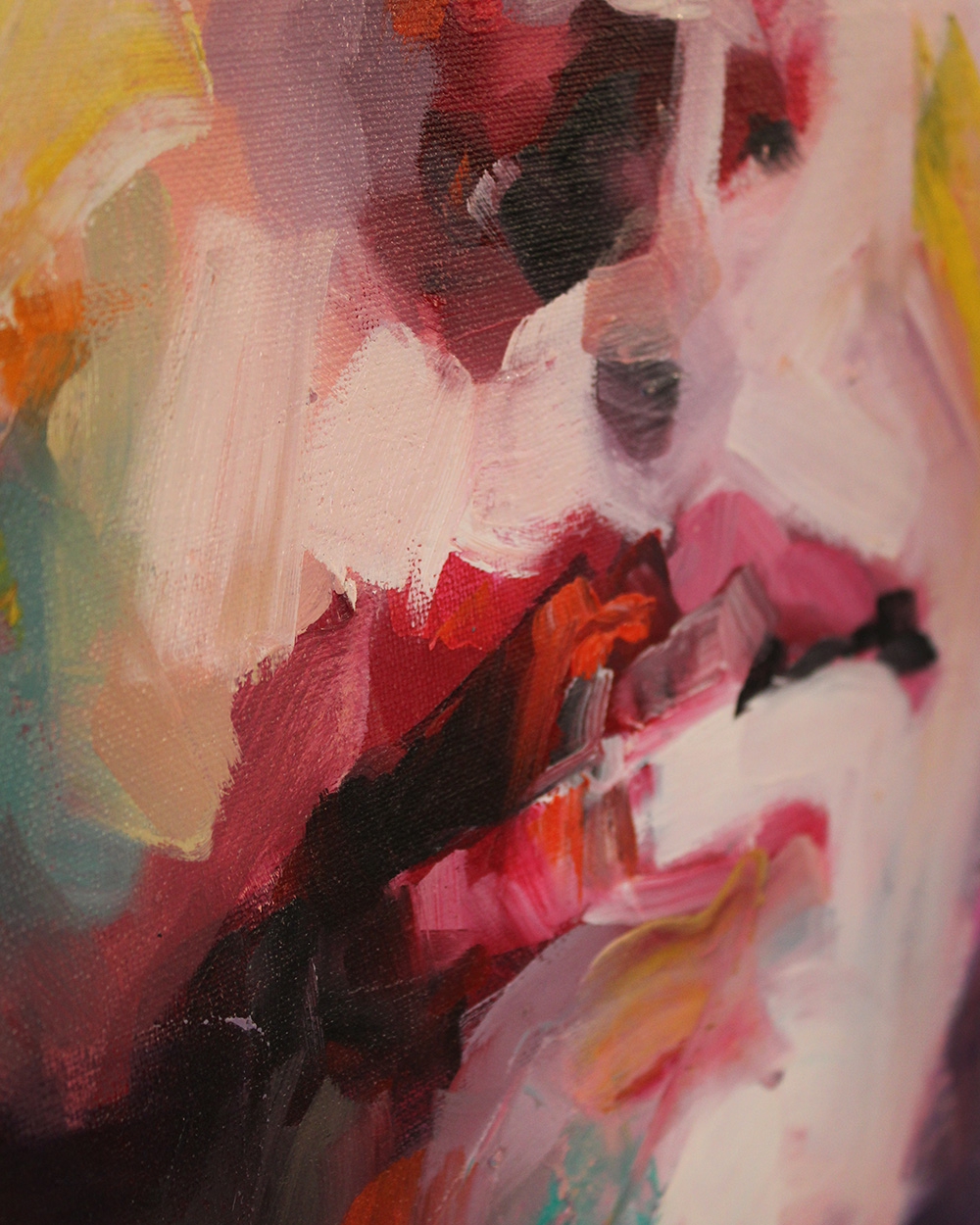 Color plays a central role in his work. Vibrant colors overlap and collide, portraits conveying vibrancy and vitality. The interplay between abstraction and figuration gives the paintings a strong psychological presence, the subject appears both tangible and fleeting at the same time.