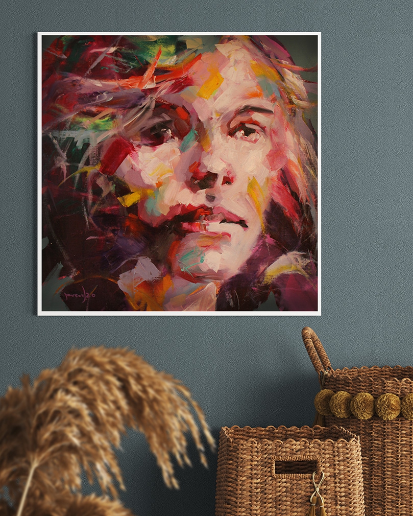 The artist Jimenez´ style is immediately recognizable through his expressive, highly gestural approach to portraiture. His paintings seek to reveal the unique inner character of each subject, using dynamic brushstrokes and vibrant, overlapping colors. While the faces remain figurative and identifiable, thick layers of paint and spontaneous marks create a lively surface where abstraction and figuration merge, giving the portraits a strong emotional and psychological presence.