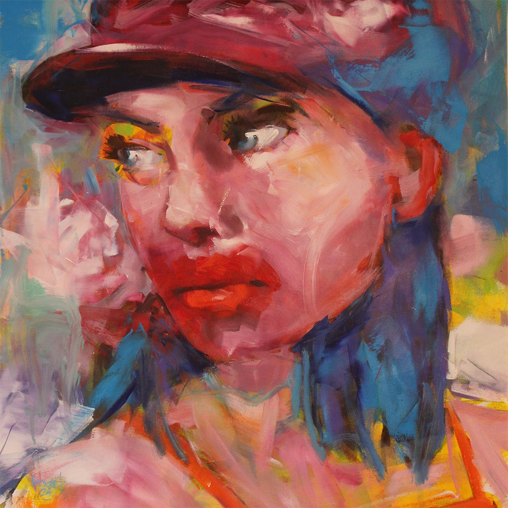 The artist Jiménez´ style is immediately recognizable through his expressive, highly gestural approach to portraiture. His paintings seek to reveal the unique inner character of each subject, using dynamic brushstrokes and vibrant, overlapping colors. While the faces remain figurative and identifiable, thick layers of paint and spontaneous marks create a lively surface where abstraction and figuration merge, giving the portraits a strong emotional and psychological presence.