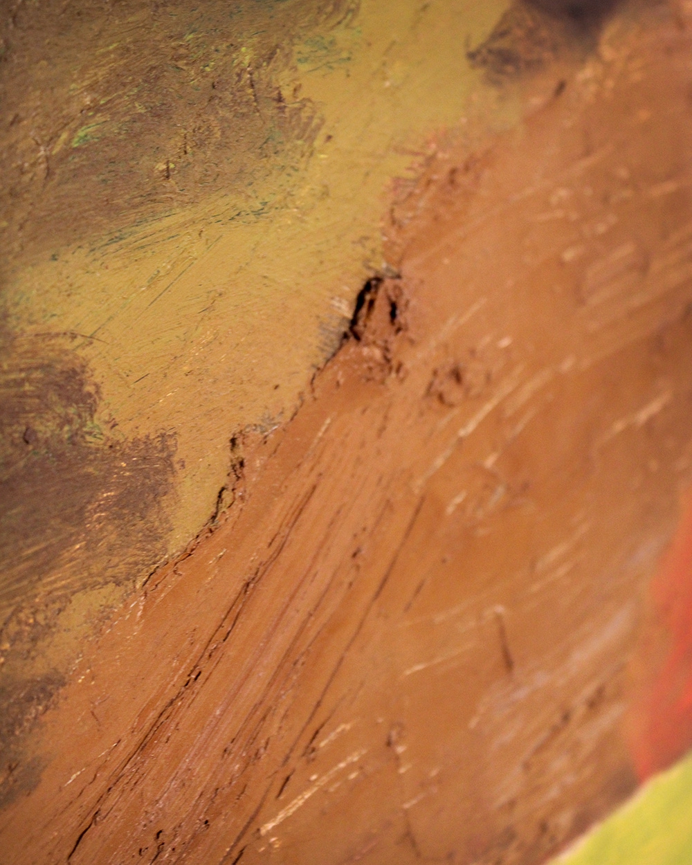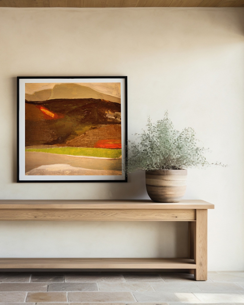 This abstract landscape painting evokes the feeling of earth and horizon through layered textures and warm, natural tones. Thick, expressive brushstrokes in yellow and red emerge from a muted, earthy background, creating depth and movement. The work captures not a specific place, but the memory and atmosphere of a landscape — raw, tactile, and emotionally charged.