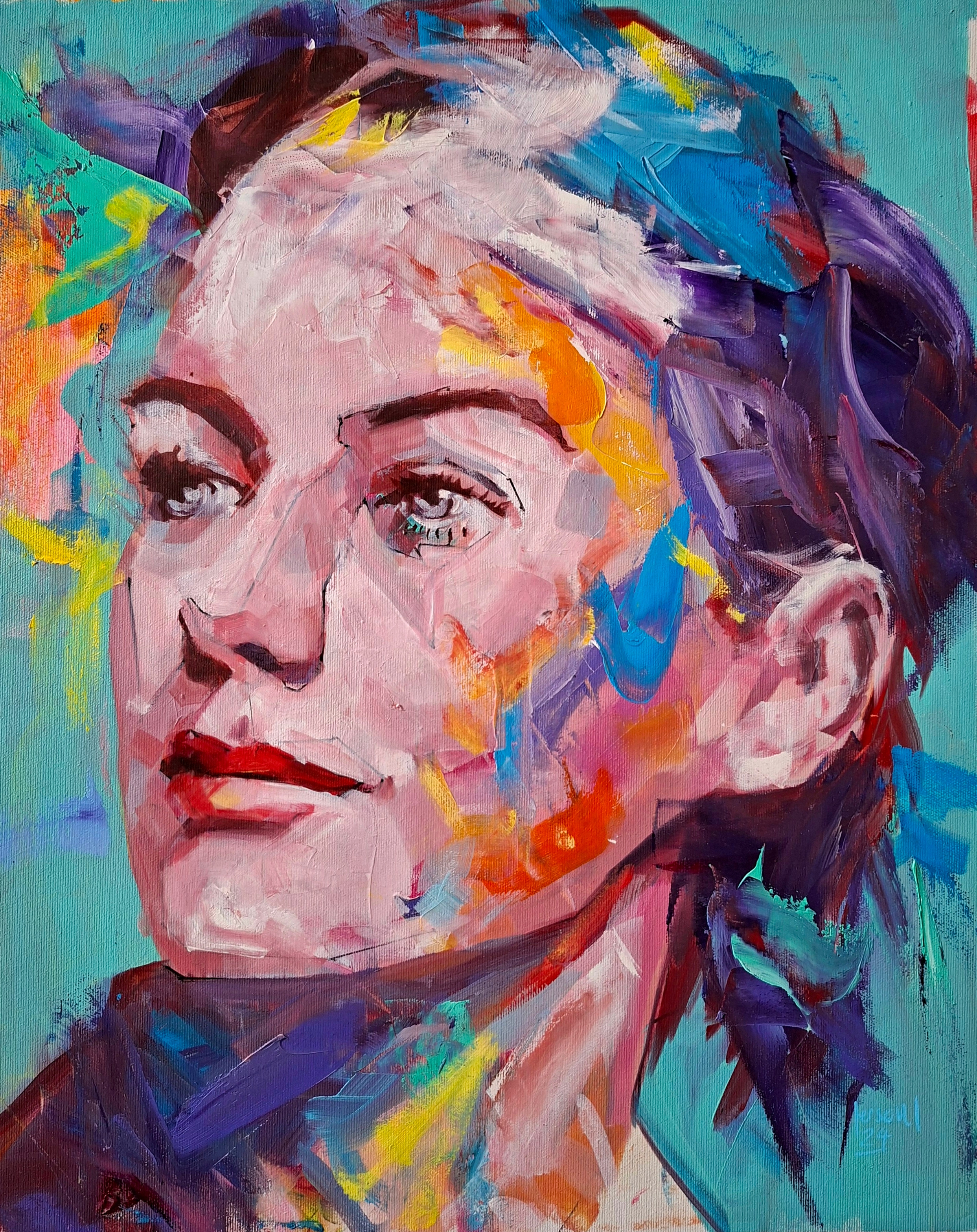 The artist Jimenez´ style is immediately recognizable through his expressive, highly gestural approach to portraiture. His paintings seek to reveal the unique inner character of each subject, using dynamic brushstrokes and vibrant, overlapping colors. While the faces remain figurative and identifiable, thick layers of paint and spontaneous marks create a lively surface where abstraction and figuration merge, giving the portraits a strong emotional and psychological presence.