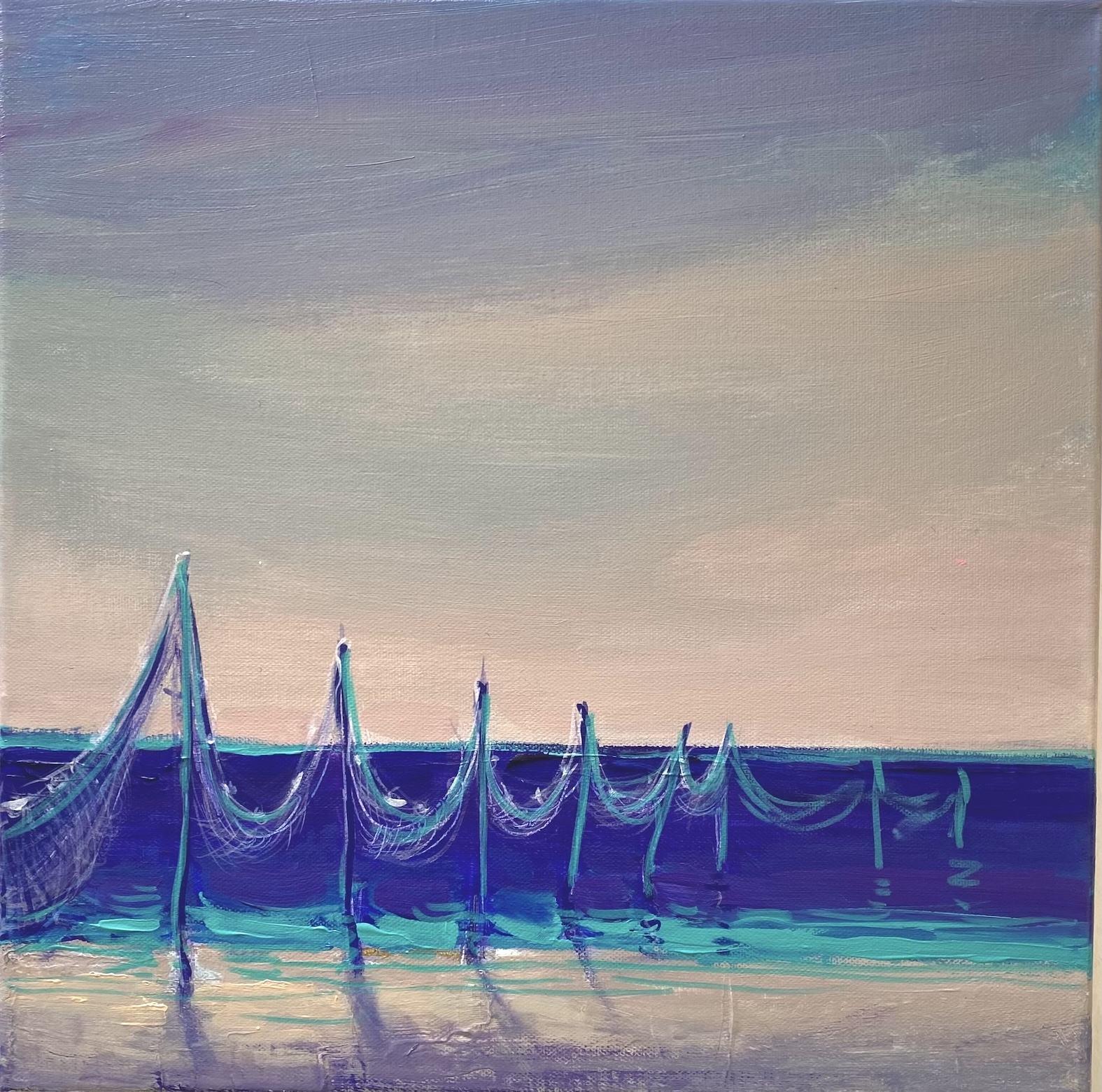 This seascape from the 2026 series by Gyunay Aliev captures a tranquil, dreamlike atmosphere, where soft purples and deep blues merge across sea and sky. Painted in acrylic on a 40 × 40 cm canvas, the delicate nets and gentle shoreline evoke a poetic, dreamy coastal moment.