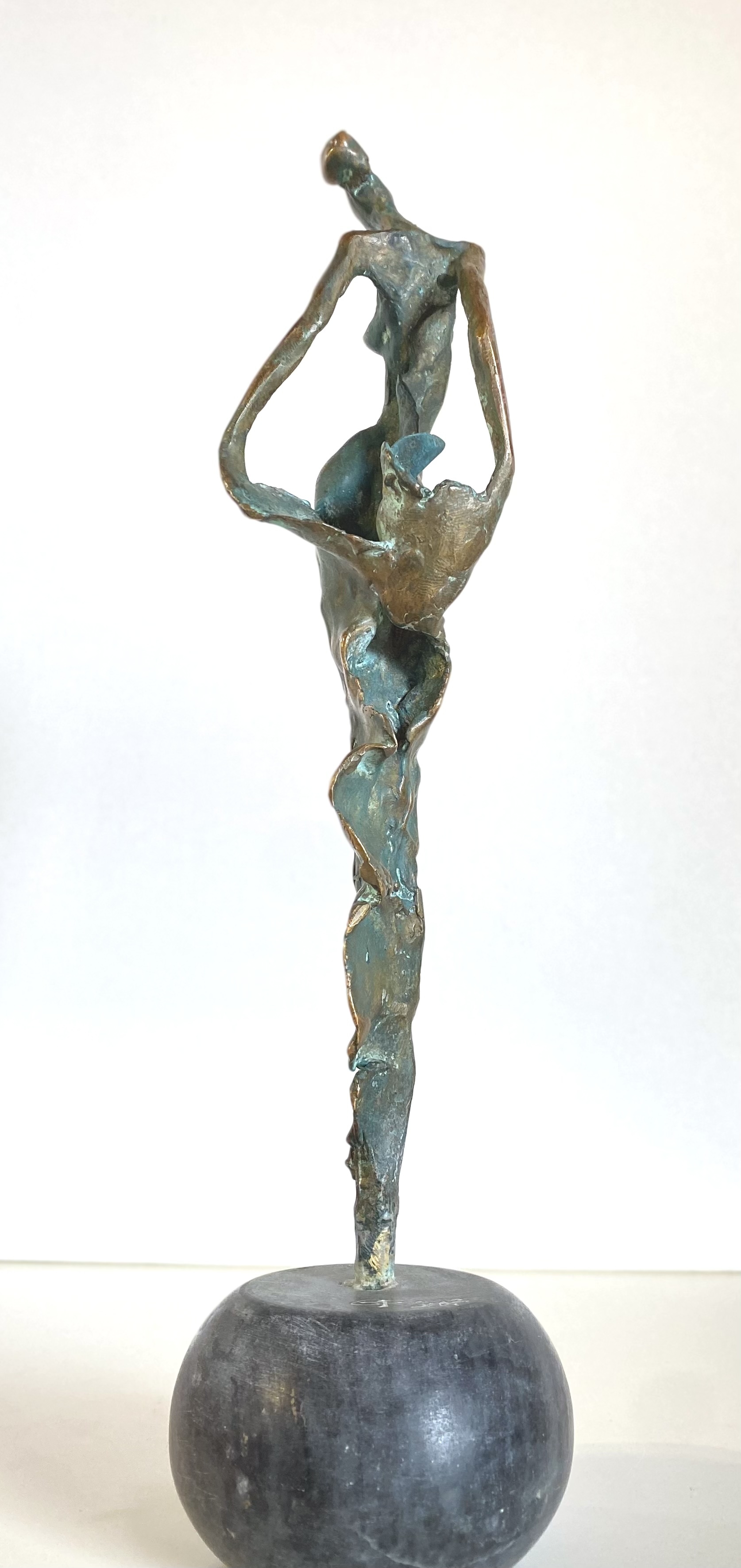 This shiny contemporary bronze sculpture of a dancer blends elegance with a playful, whimsical spirit. Slightly abstract in form, she is captured in a dynamic pose that feels both strong and tender, as if frozen mid-dance.