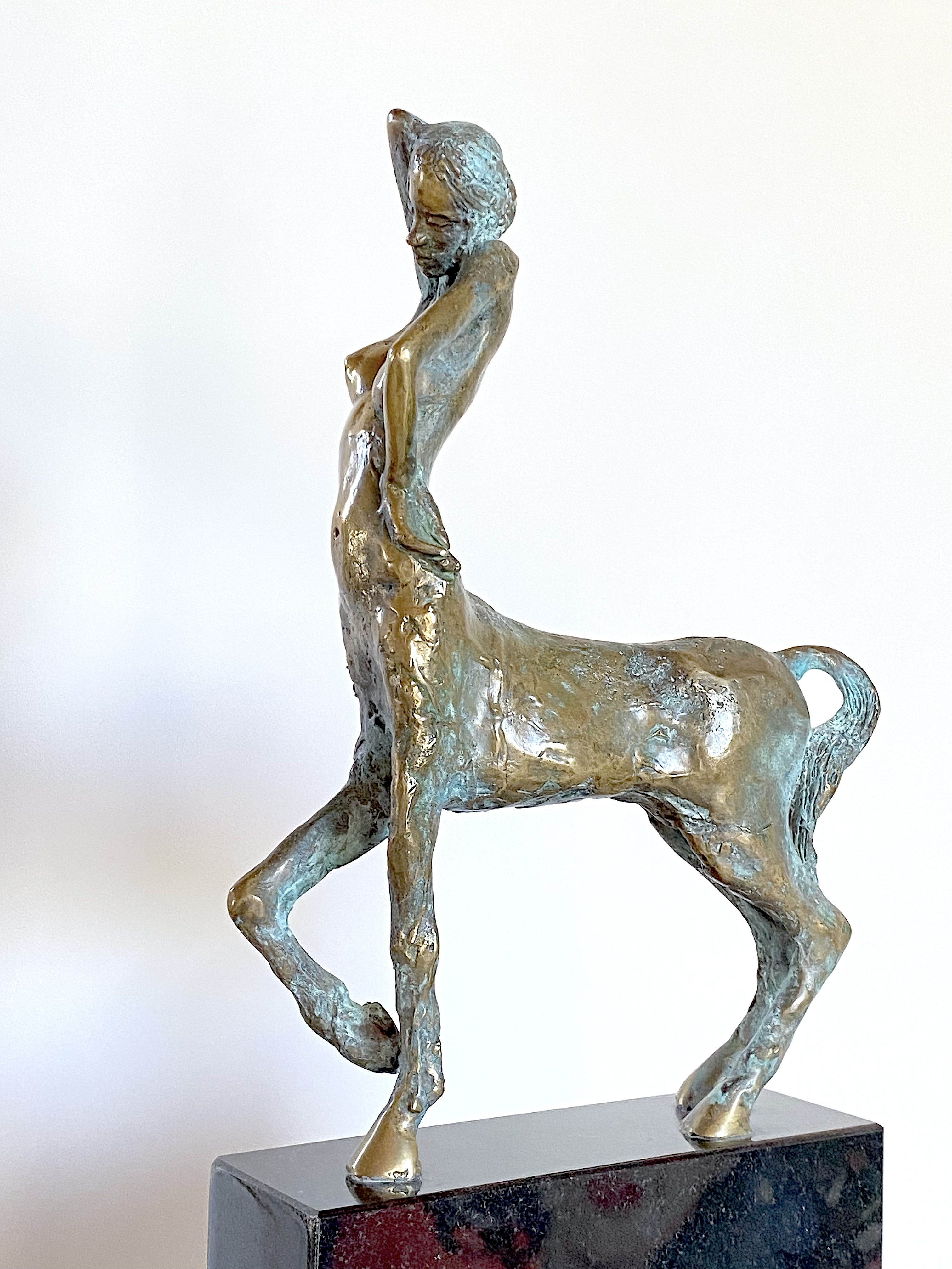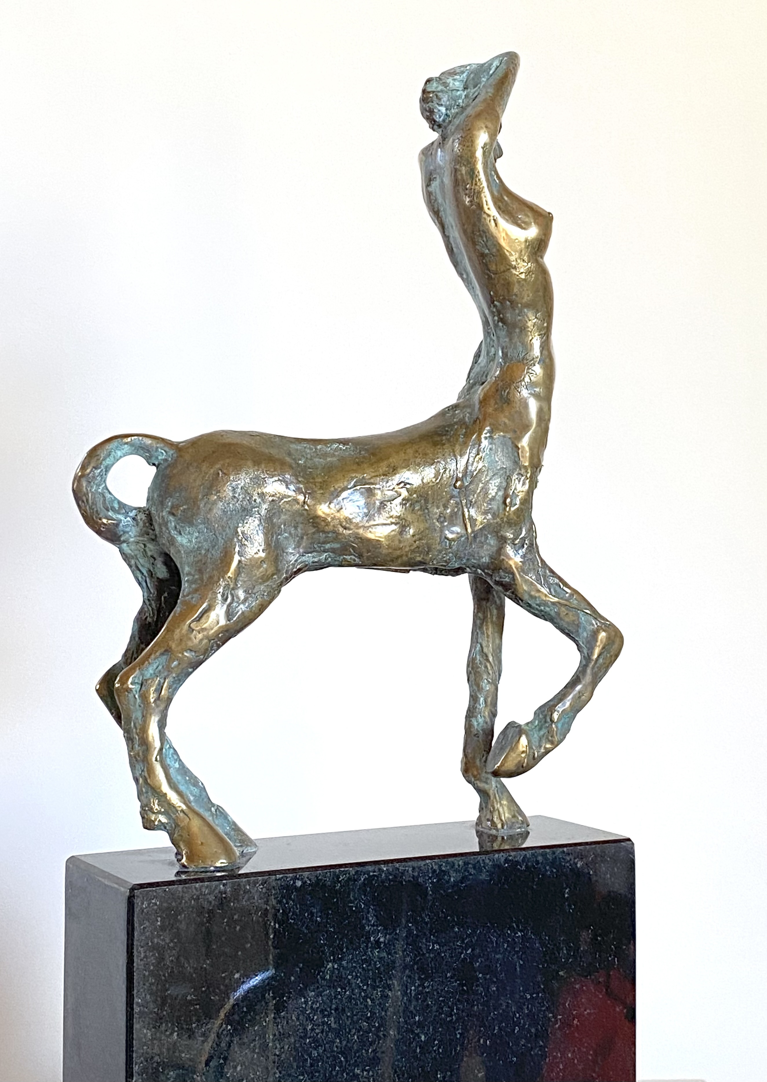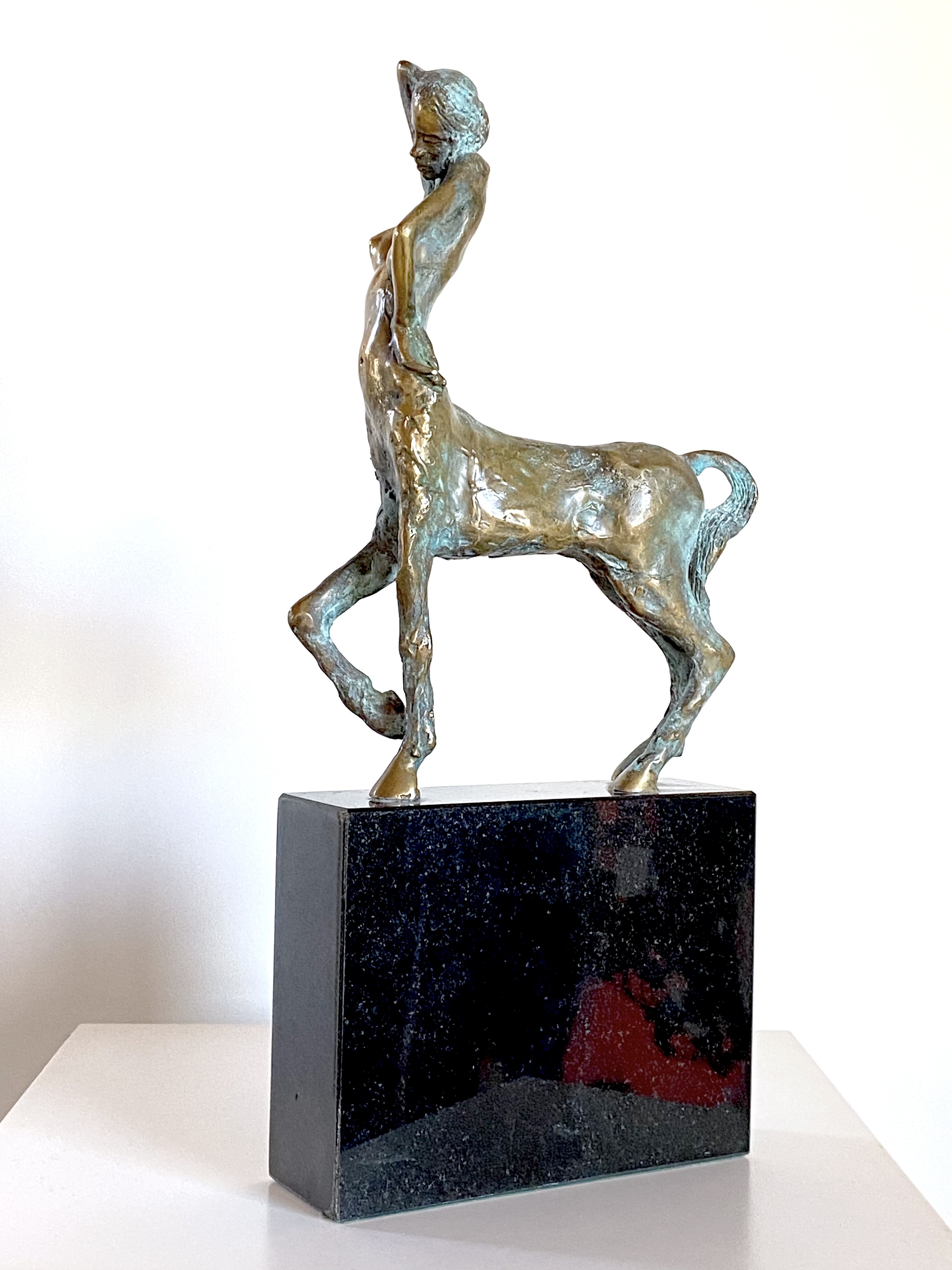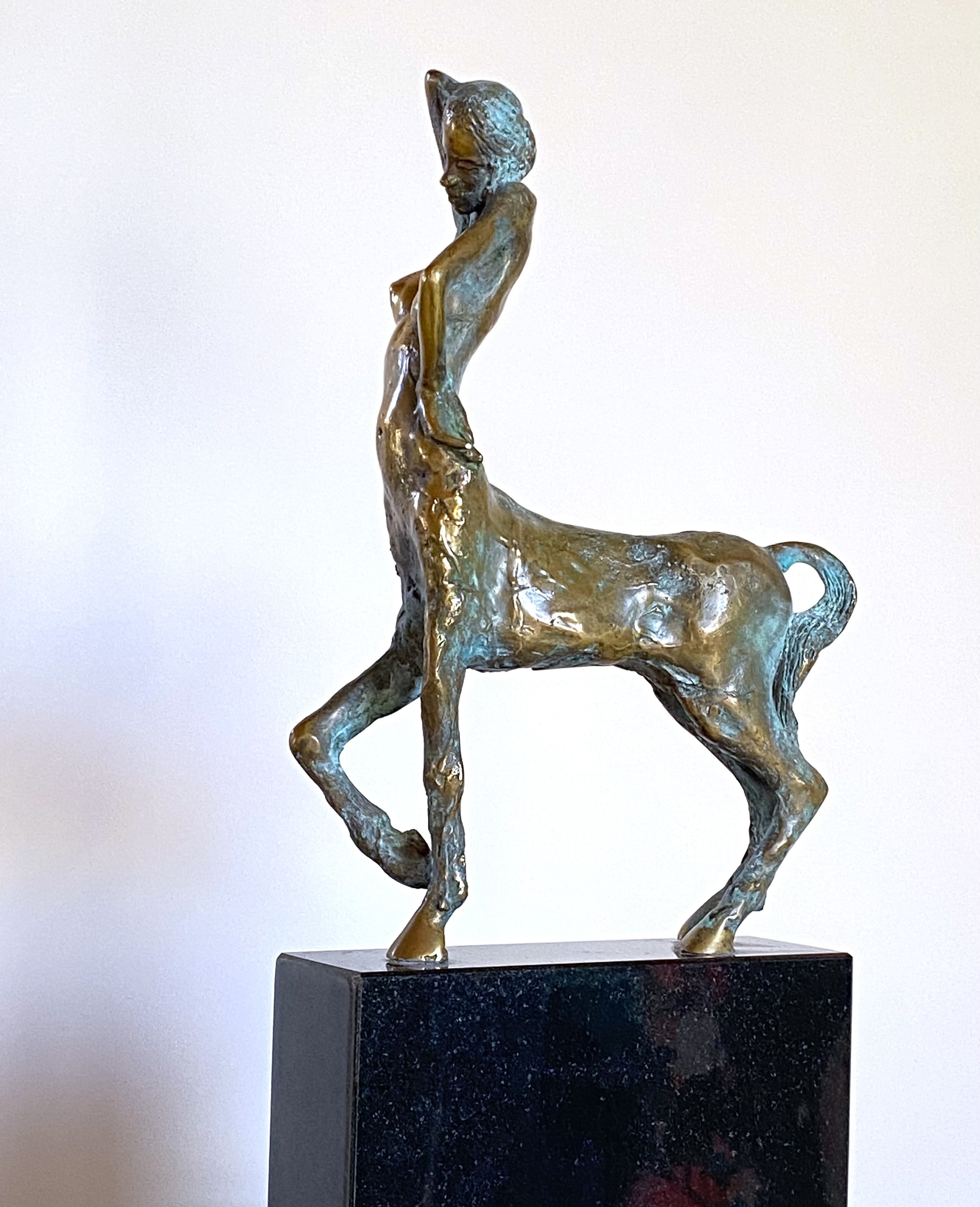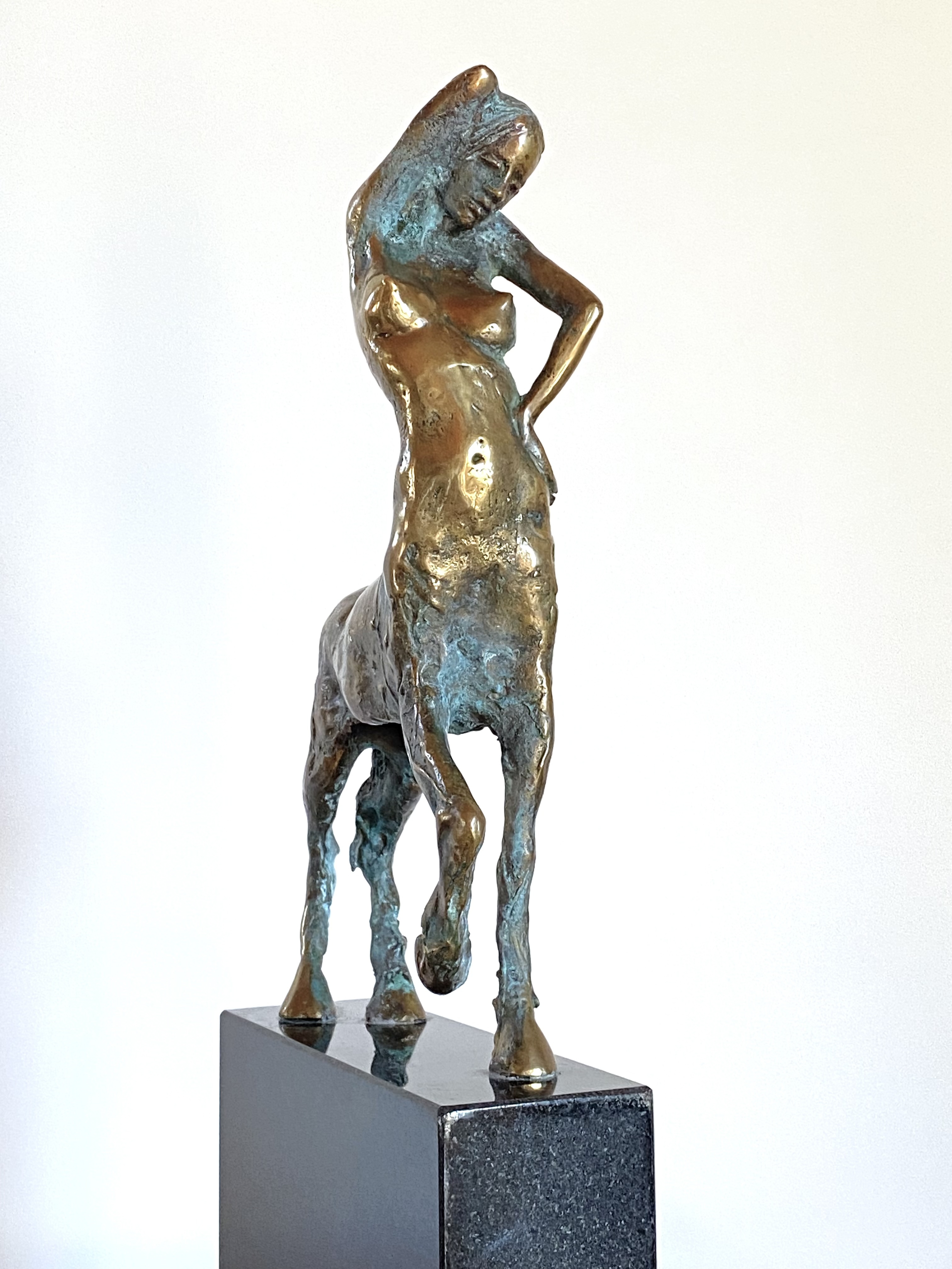 This shiny bronze sculpture depicts a female centaur, combining a woman’s torso with the body of a horse. Created in 2012, it is cast in bronze with a gold patina and set on black granite, measuring 44 × 20 × 7 cm.