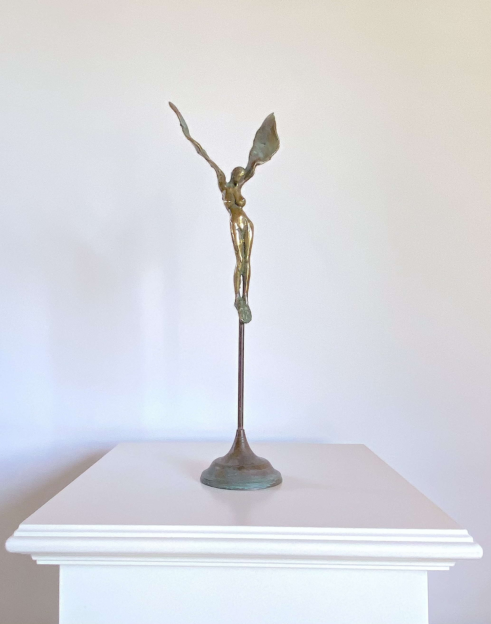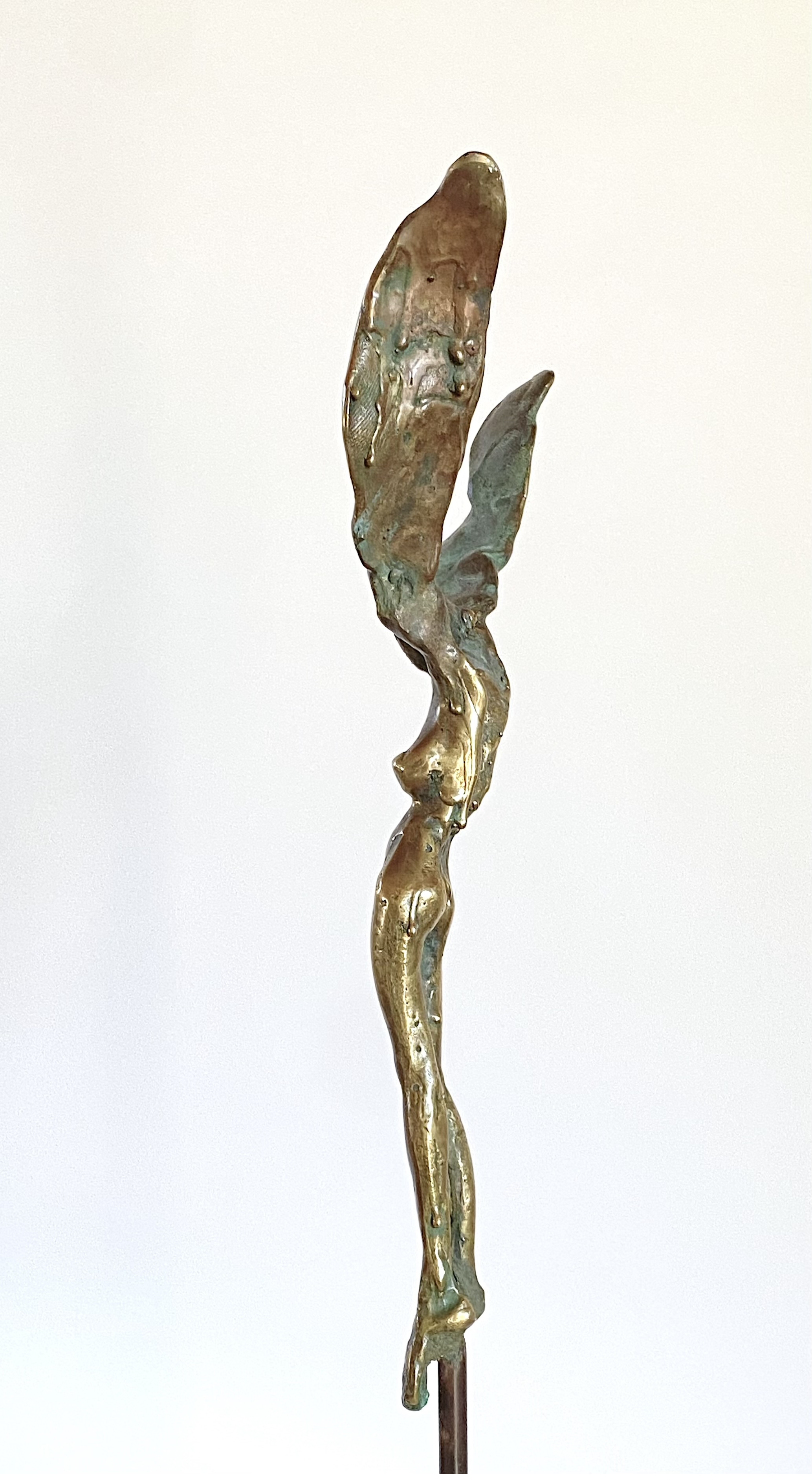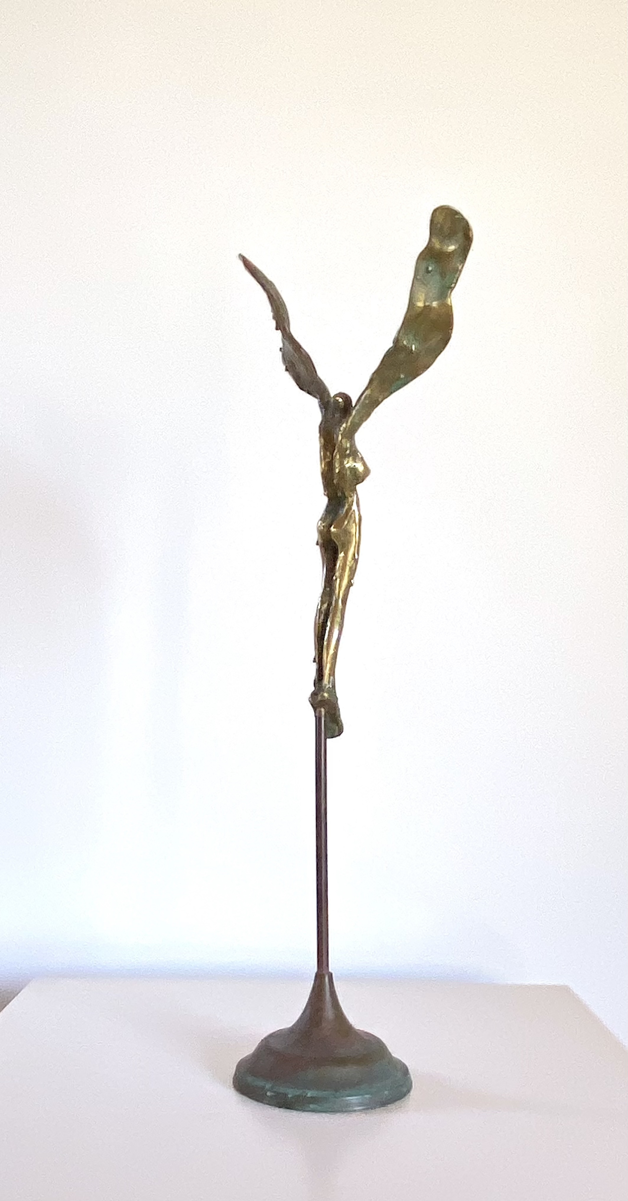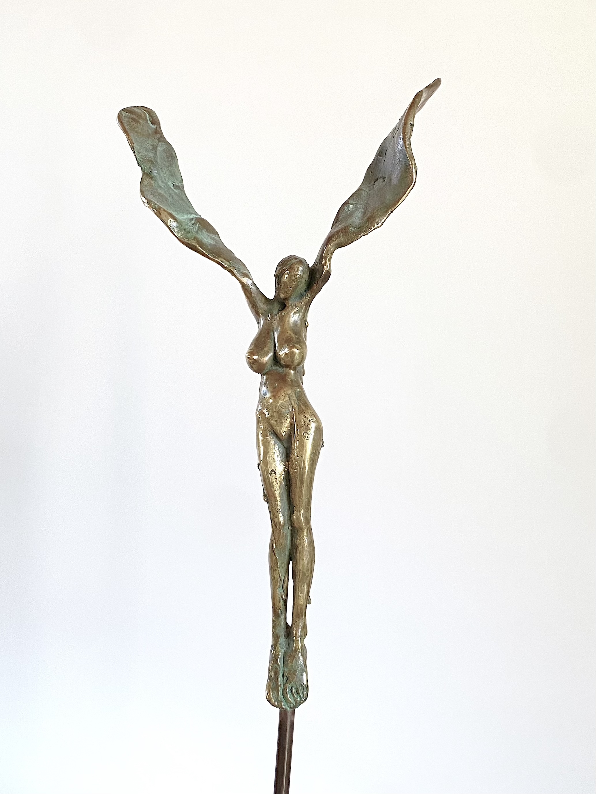 This bronze sculpture “Fallen Angel” depicts a woman with large wings, finished in a luminous gold tone. As a whimsical feminine hybrid, she evokes both fragility and strength, as if caught in the moment between ascent and descent, an angel paused in transformation, forever becoming.