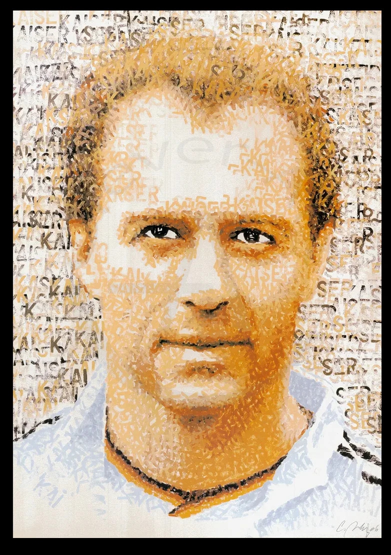 The portrait of football icon Kaiser (Franz Beckenbauer) was printed using offset printing on heavy 300g paper. It is hand-signed, numbered, and registered.The professional application of typography and printing techniques results in an artistic and expressive image that combines abstract and realistic elements in portraiture.