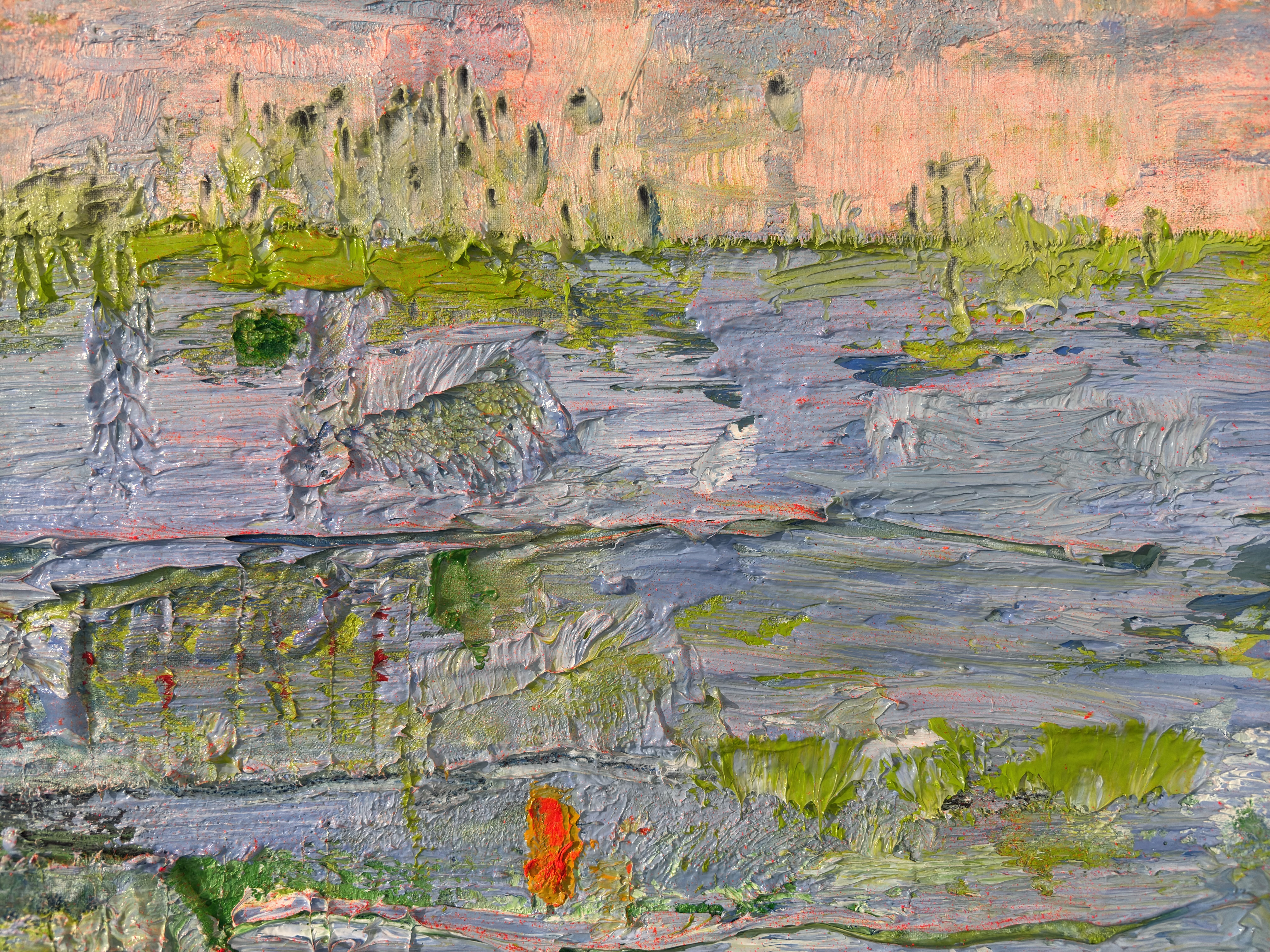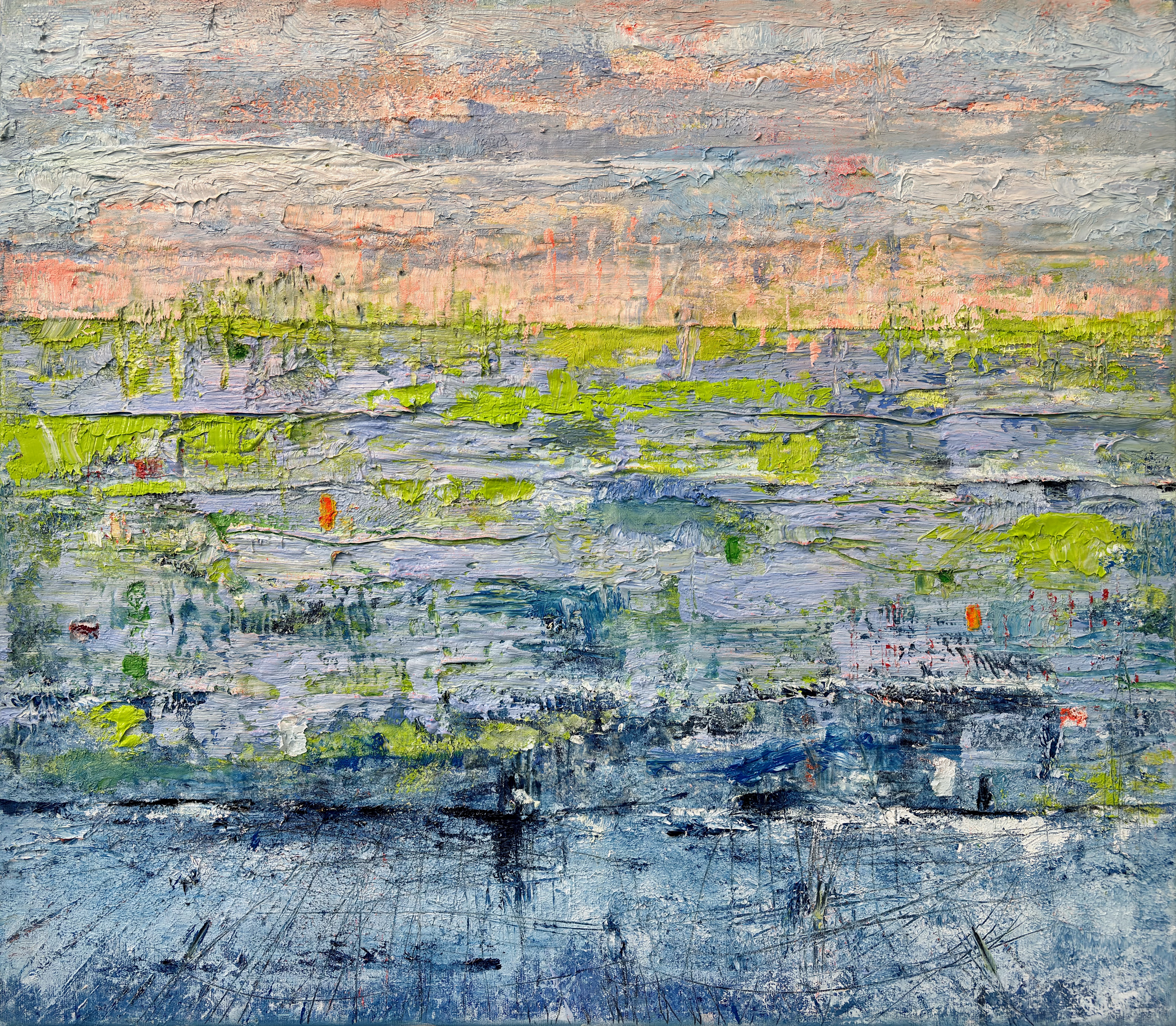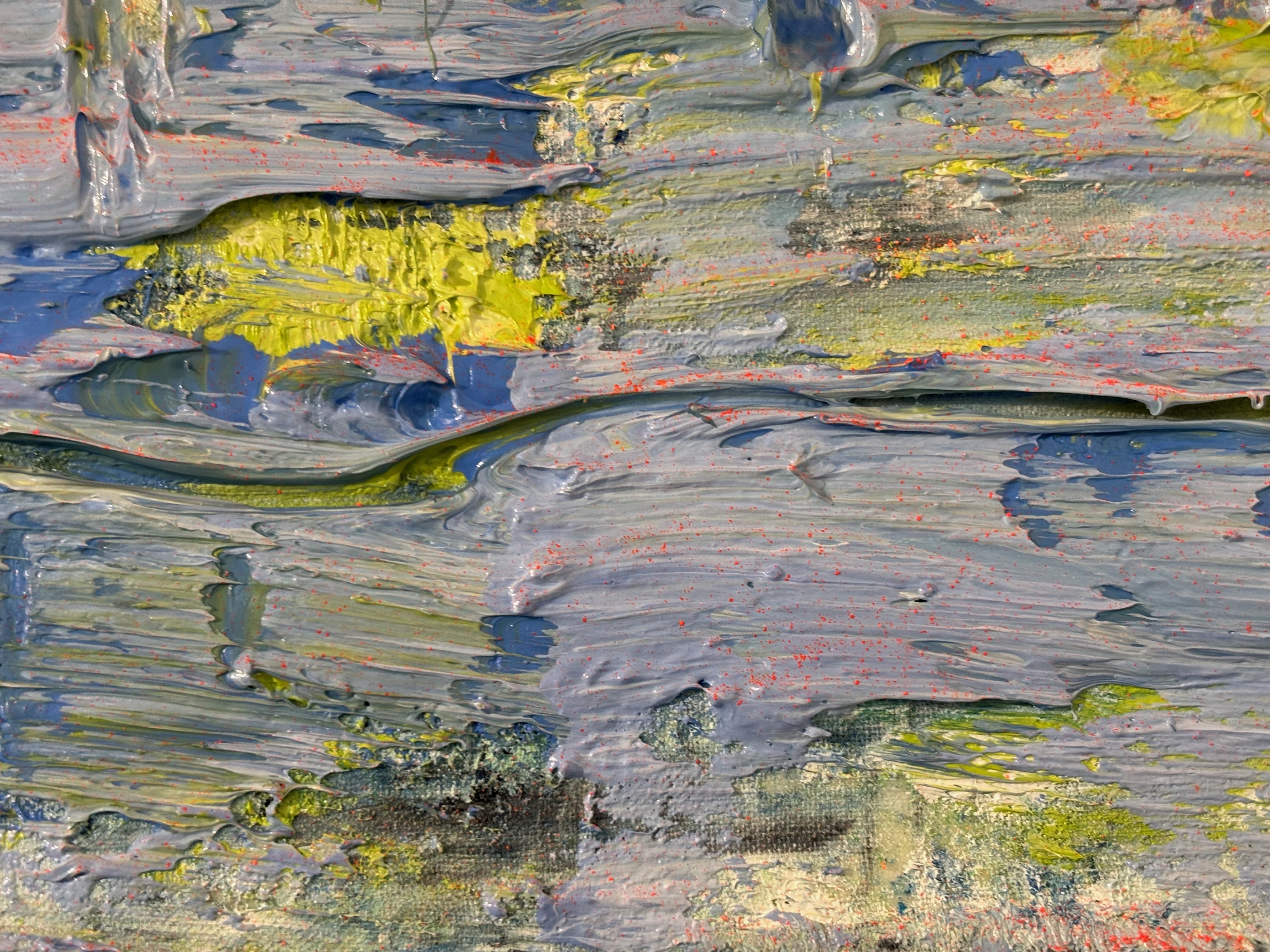De Duitse olieverfschilder Annette Selle creëert werken die textuur, kleur en sfeer in balans brengen met poëtische subtiliteit. In dit werk lossen lagen geel, blauw, wit, grijs en zachtroze op in abstractie, waardoor het schilderij een staat van onafhankelijkheid bereikt en de kijker een ruimte biedt om contact te maken met zijn eigen realiteit. De harmonieuze mix van serene tinten en dynamische texturen creëert een serene sfeer die de kijker uitnodigt om zich te verliezen in de schoonheid van abstractie en persoonlijke introspectie.