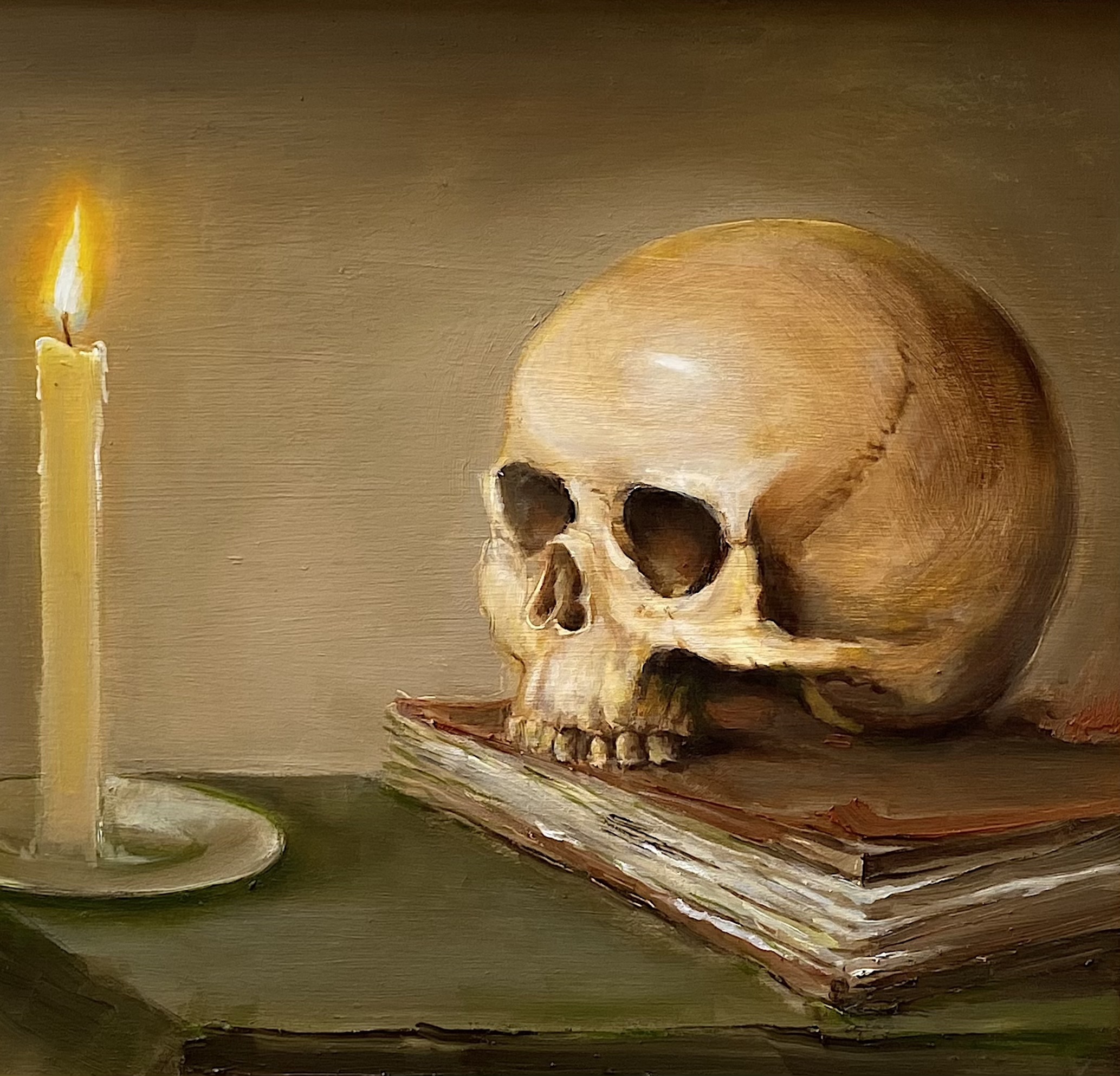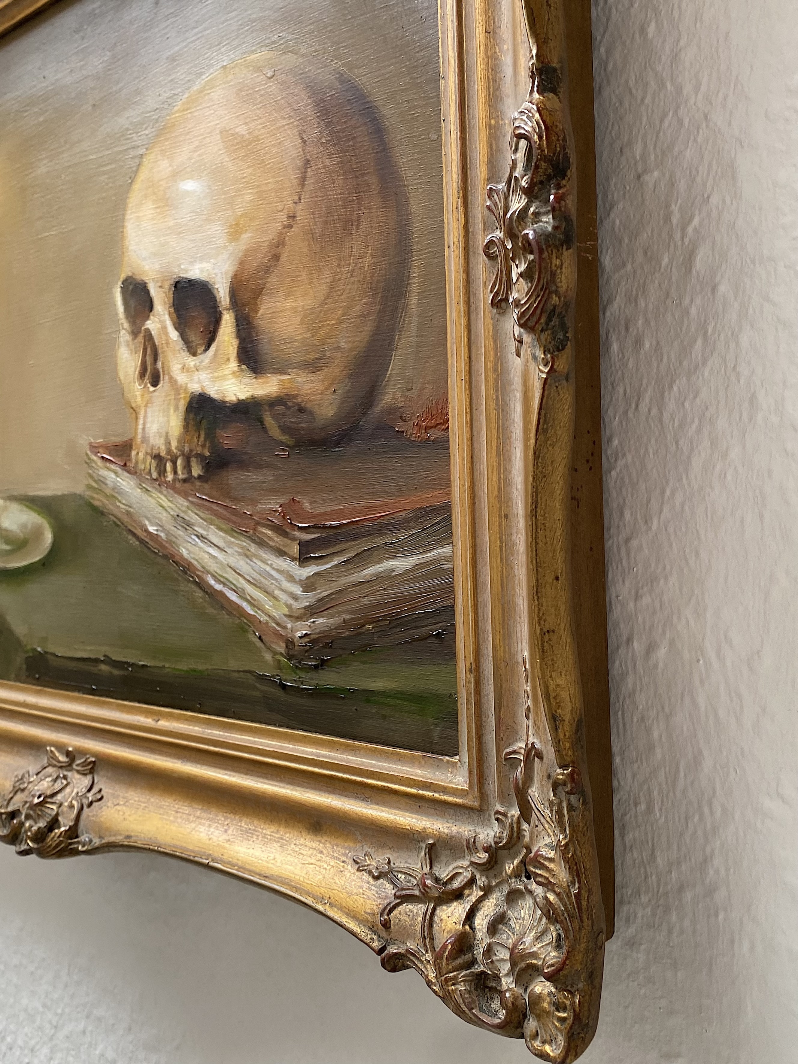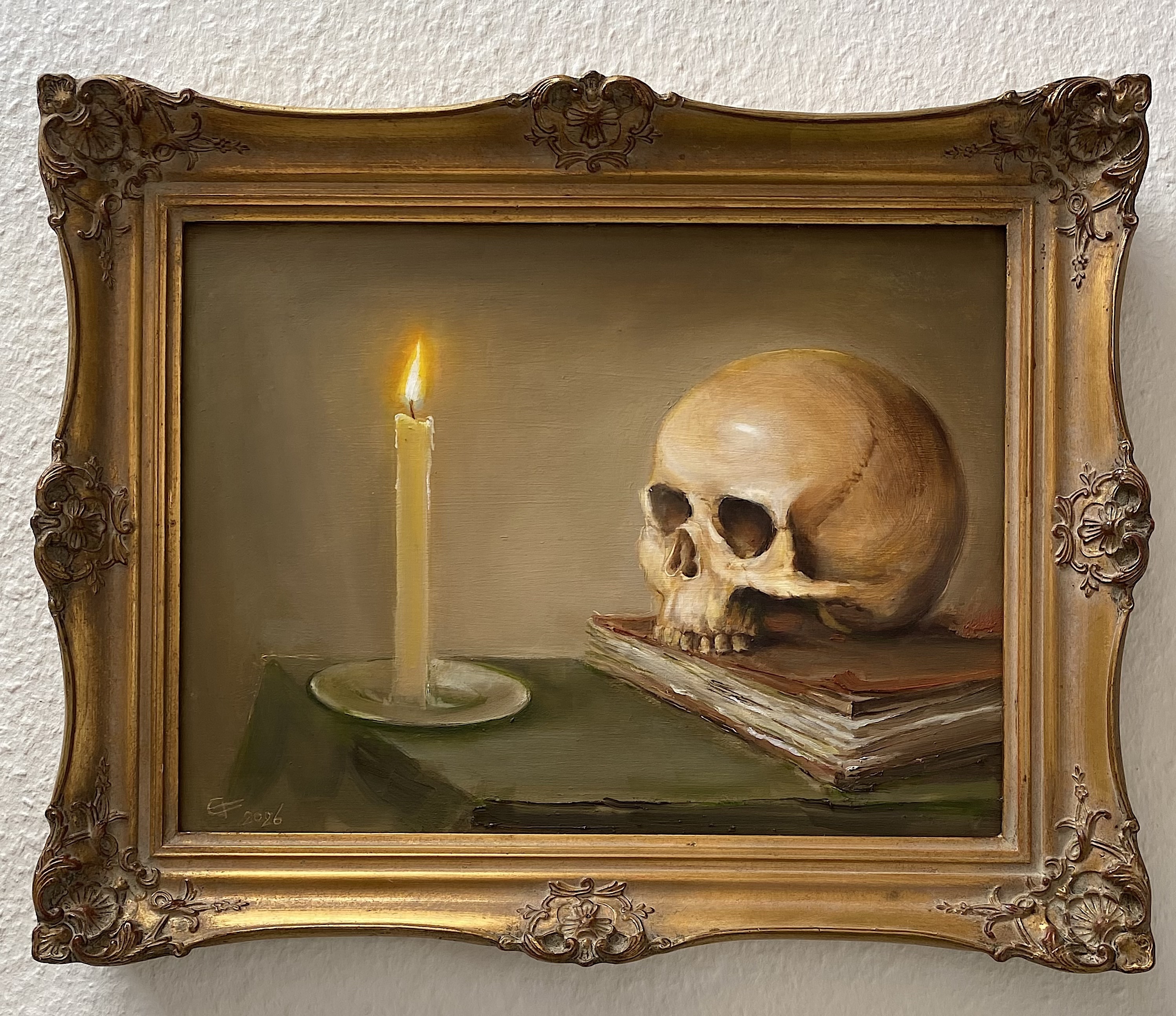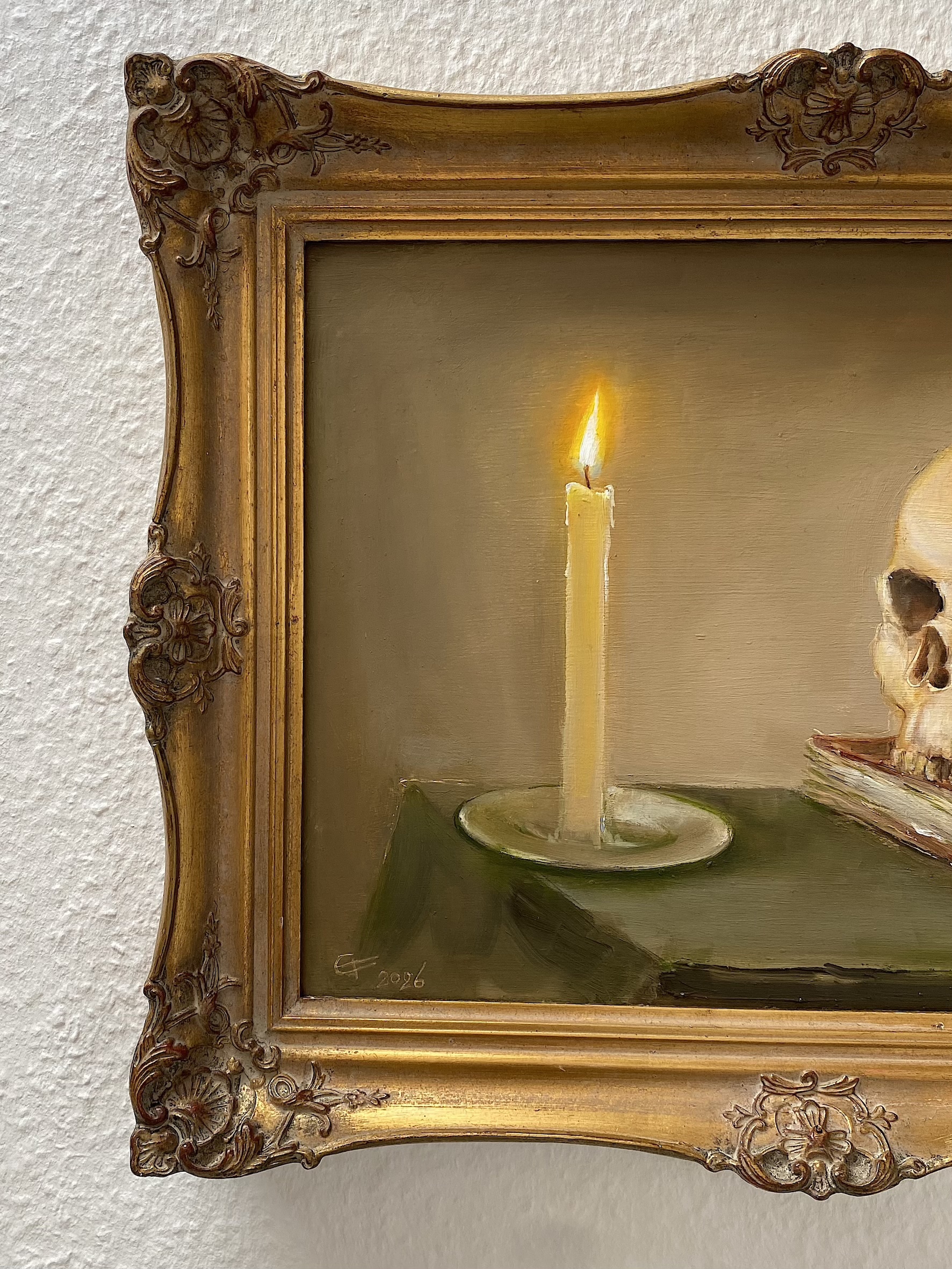 Dit vanitas-schilderij, 'Schedel op boek met kaars' van Gyunay Aliev, is een fijn uitgevoerd olieverfschilderij op houten paneel van 40 × 30 cm (afmetingen van het schilderij: 38 × 29 cm) en wordt oningelijst verkocht. De compositie, uitgevoerd in een realistische stijl, van een schedel die rust op oude boeken naast een zacht brandende kaars, roept thema's op van vergankelijkheid, kennis en het verstrijken van de tijd.
